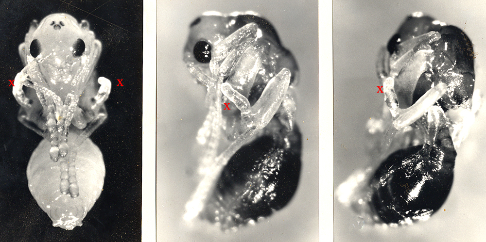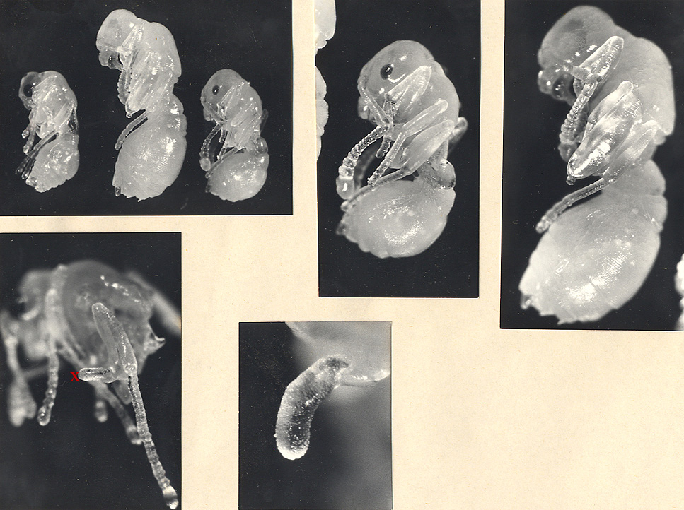 Oben links: Puppen von Männchen, Gyne und Arbeiterin; rechts: Arbeiterin und Gyne vergrößert: Sie tragen keine ungewöhnlichen Anhänge. Unten links: Männchenpuppe von schräg hinten. Bei X ist der Hinterbein-Anhang zu sehen. Mitte: Der Anhang vergrößert.