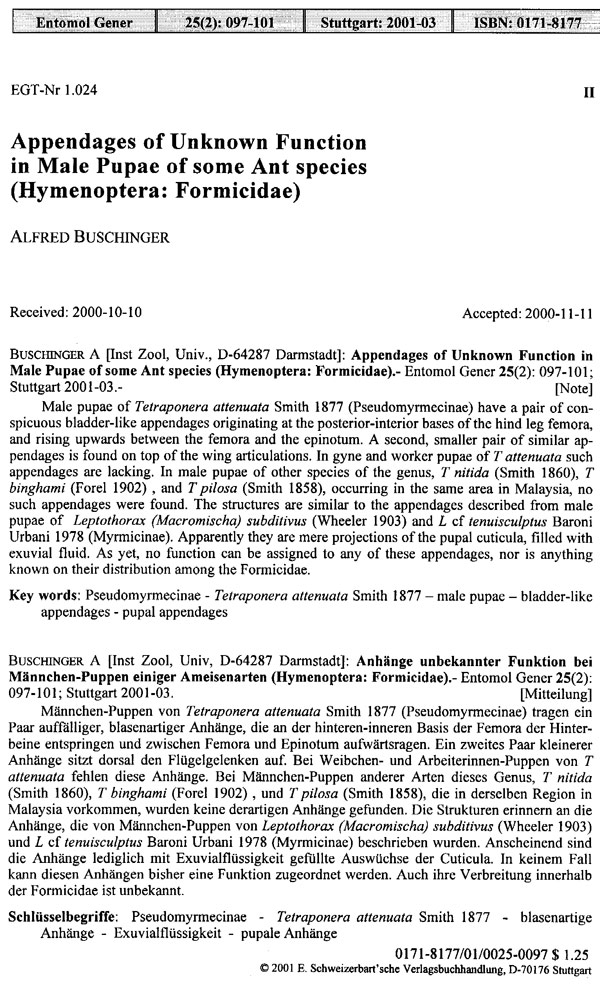 Ralf D. Schumann (1992): Peculiar appendages in male pupae of Leptothorax subditivus (Wheeler) (Hymenoptera: Formicidae). - Psyche 99:185-188.