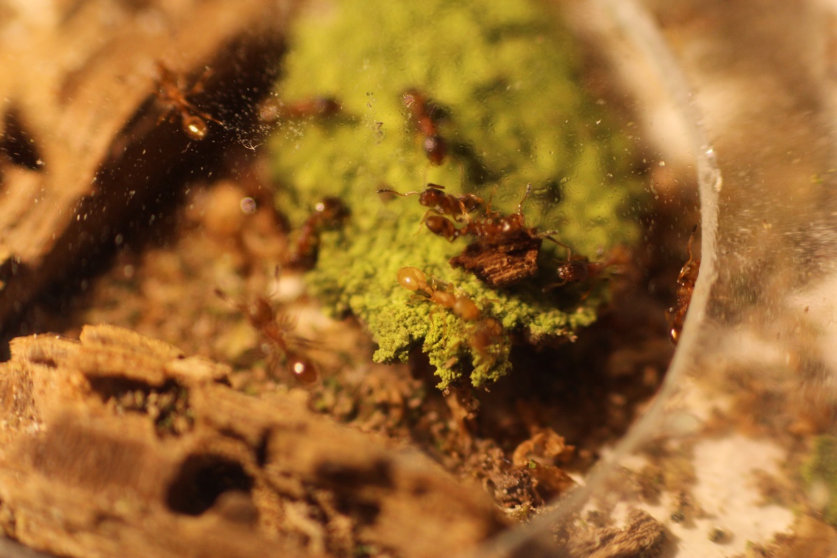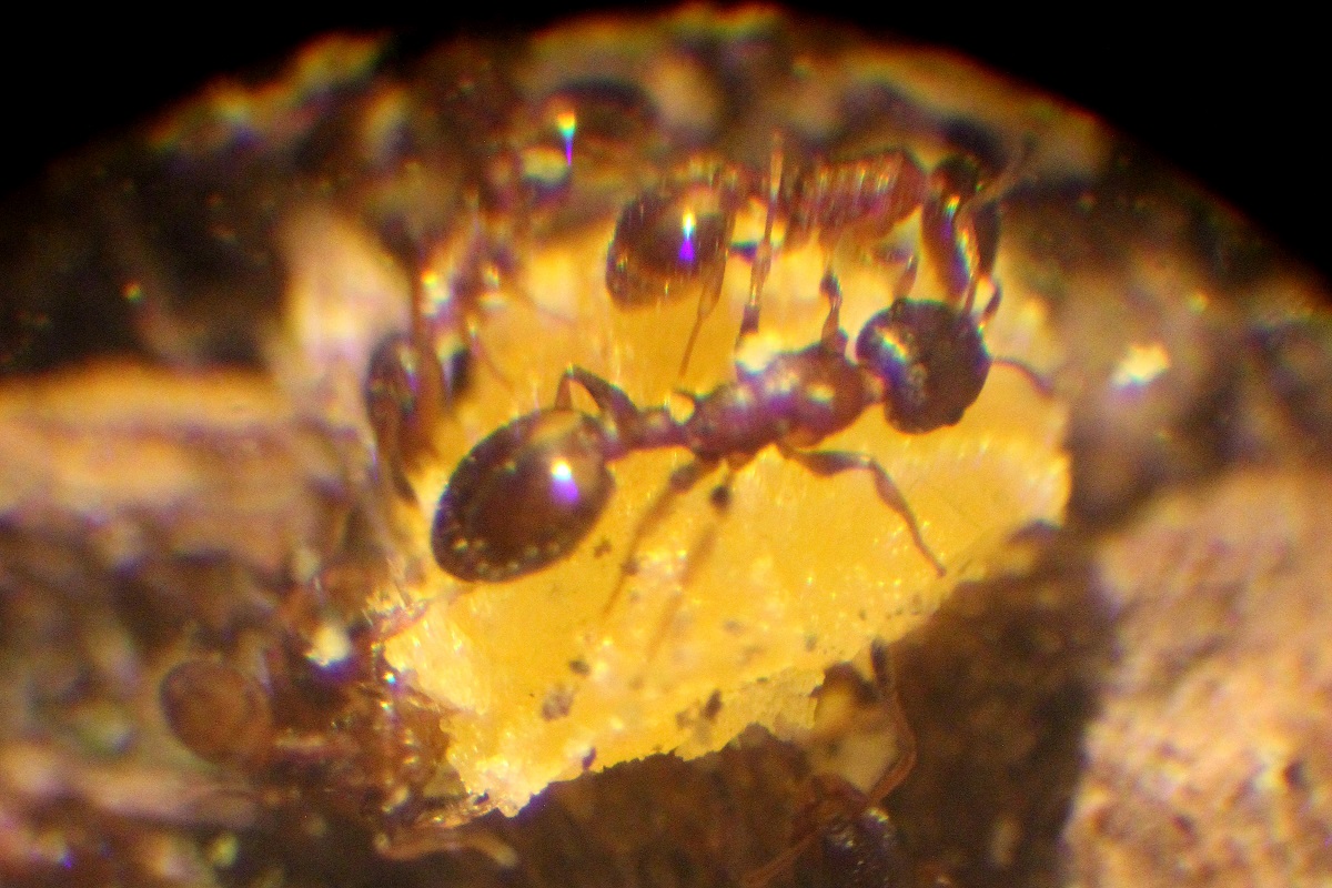aktuell halte ich eine kleine Kolonie von Temnothorax affinis. Ein Eichen-Totholzast aus dem Kronenbereich war beim Januarsturm 2018 heruntergebrochen. Aus der Spitze konnte ich das Volk komplett bergen und in ein Gipsnest umsiedeln. Davon sind 4 Arbeiterinnen - wie bereits früher im AP beschrieben wurde - parasitiert. Sie halten sich überwiegend bei der Winterbrut in Königinnennähe auf, eine fouragiert auch mal, wie das Bild zeigt.