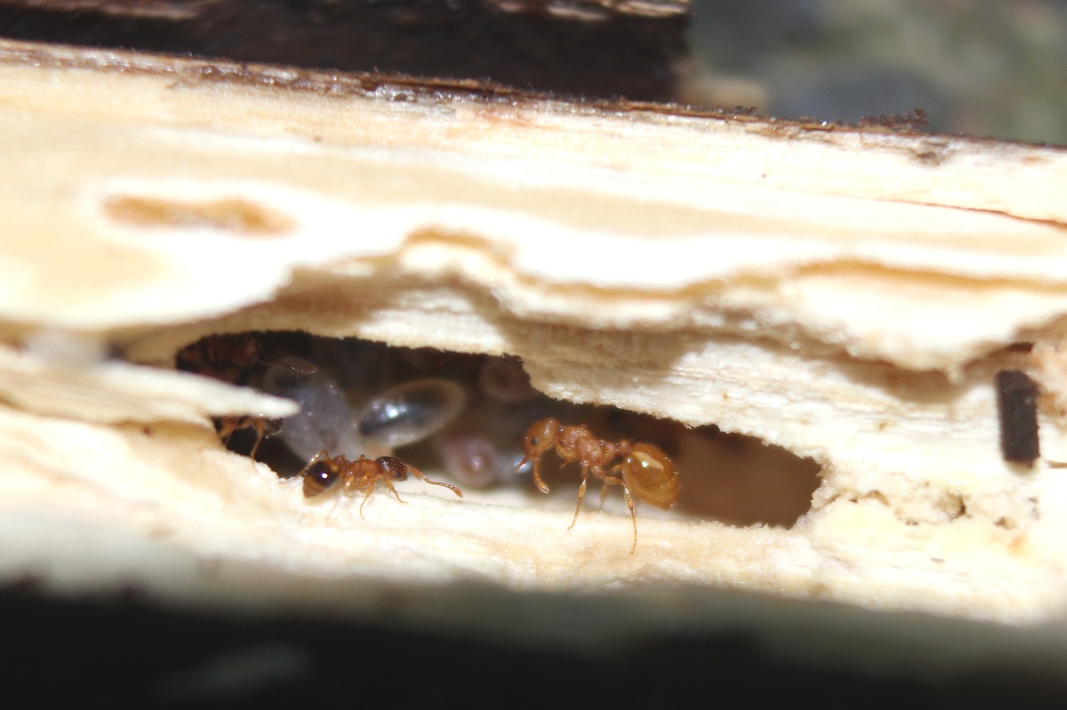 Beim Aufspalten eines am Boden liegenden Aststückchens (20.05.2014) sah ich im Nest eine deutlich größere Arbeiterin. Im ersten Moment dachte ich deshalb aufgeregt an eine sozialparasitische Art und nahm den Ast mit. Das Volk habe ich über mehrere Monate zuhause beobachtet. Bei diesem hellgelben Einzeltier gab es im Nest keine Verhaltensauffälligkeiten gegenüber den anderen Arbeiterinnen. Es war das einzige farblich abweichende Exemplar des Volkes, gleichzeitig Intermorphe und Zwischenwirt .