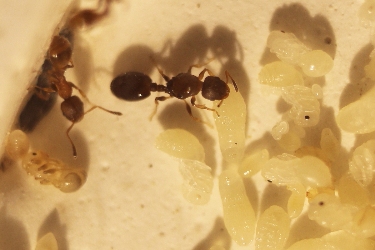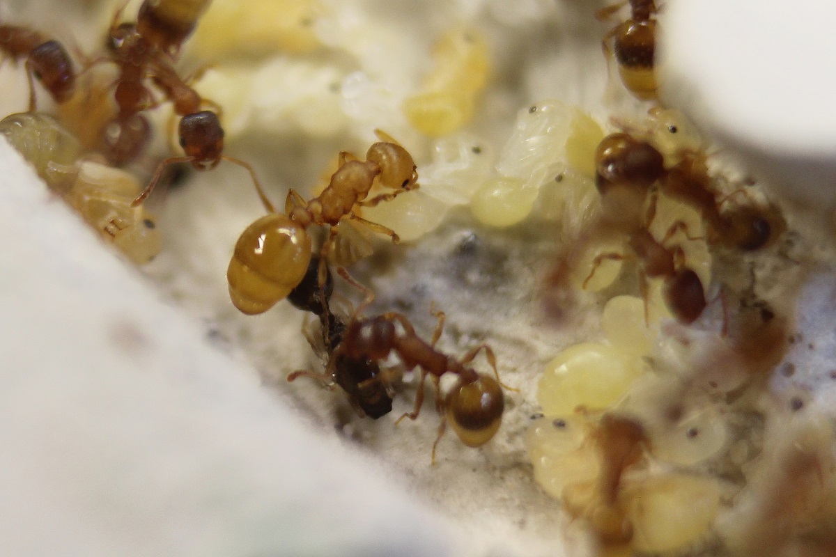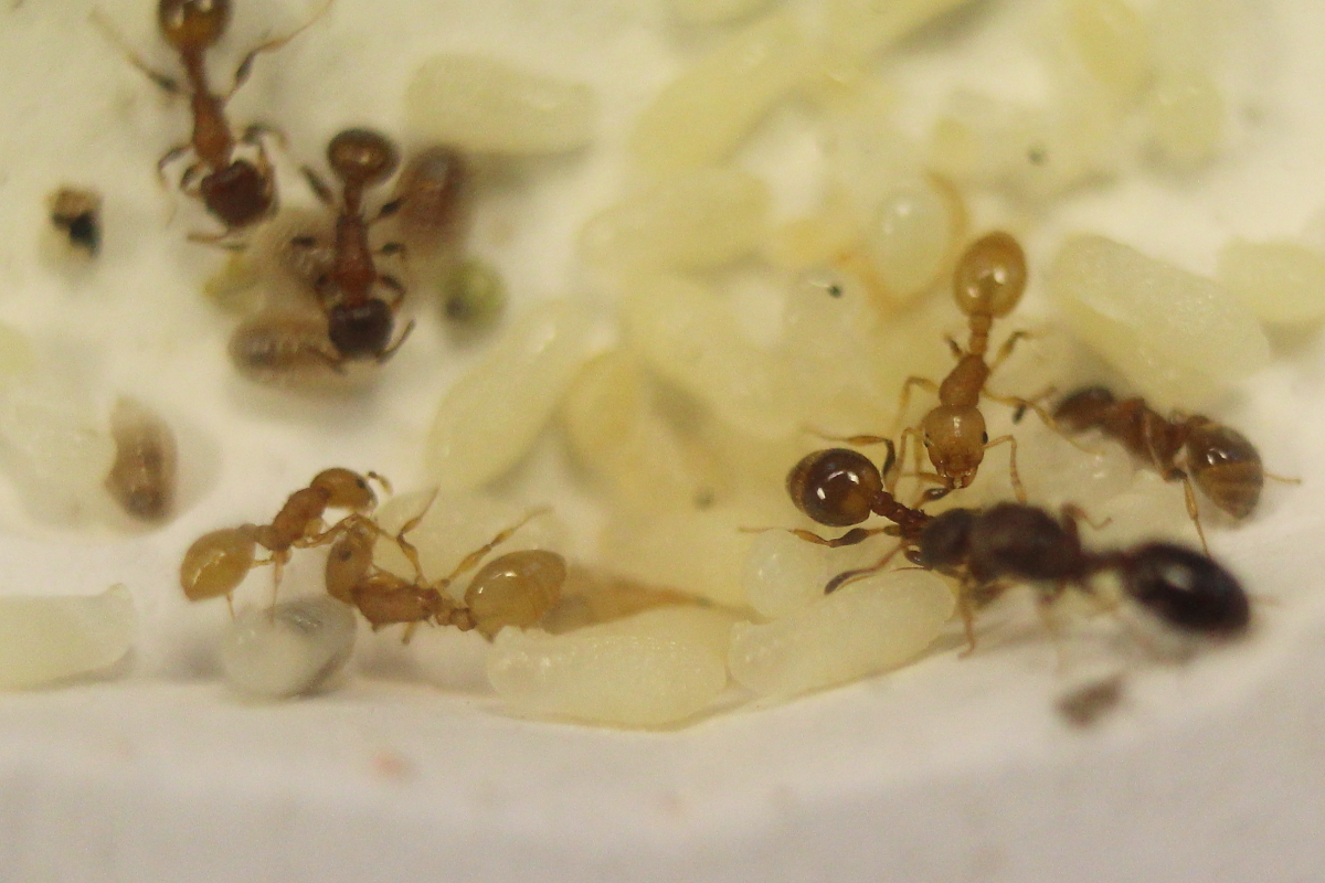 Das im März vorgestellte, mit Bandwurfinnen befallene Volk von Temnothorax affinis besitzt inzwischen neue Eier und Larven. Die Puppen aus den vorjährigen Larven färben sich beginnend an Augen und Mandibeln bereits aus. Das intermorphe Exemplar mit den Flügelstummeln ist spurlos verschwunden.