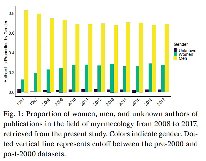 In dieser Abbildung 1 werden die Anteile an Männern (gelb), Frauen (grün) und „unbekannt“ (schwarz) unter den Autoren gegenübergestellt. In der Zeit vor 2000 (links der gestrichelten Linie) waren Frauen viel deutlicher unter-repräsentiert, ab 2008 bis 2017 hat sich der Anteil der Myrmekologinnen auf einem höheren Niveau eingependelt, doch besteht weiterhin ein erhebliches Ungleichgewicht.