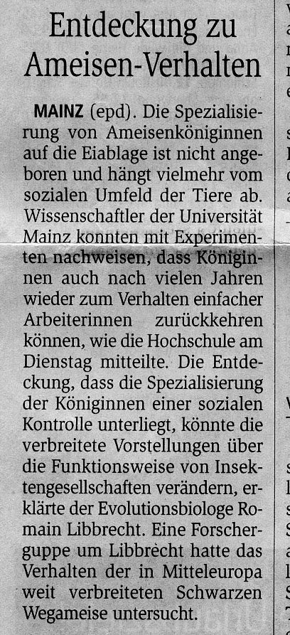 „Königinnen, so die verbreitete Ansicht, seien nur dazu da, Eier zu legen – und diese Eigenschaft sei angeboren und nicht von äußeren Faktoren beeinflusst.“ Und: "Die Spezialisierung der Königinnen unterliegt bei der Ameisenart, die wir untersucht haben, einer sozialen Kontrolle. Mit diesem Befund stellen wir das weithin akzeptierte Dogma infrage, wonach Insektenköniginnen praktisch als Eierlegemaschinen geboren werden".