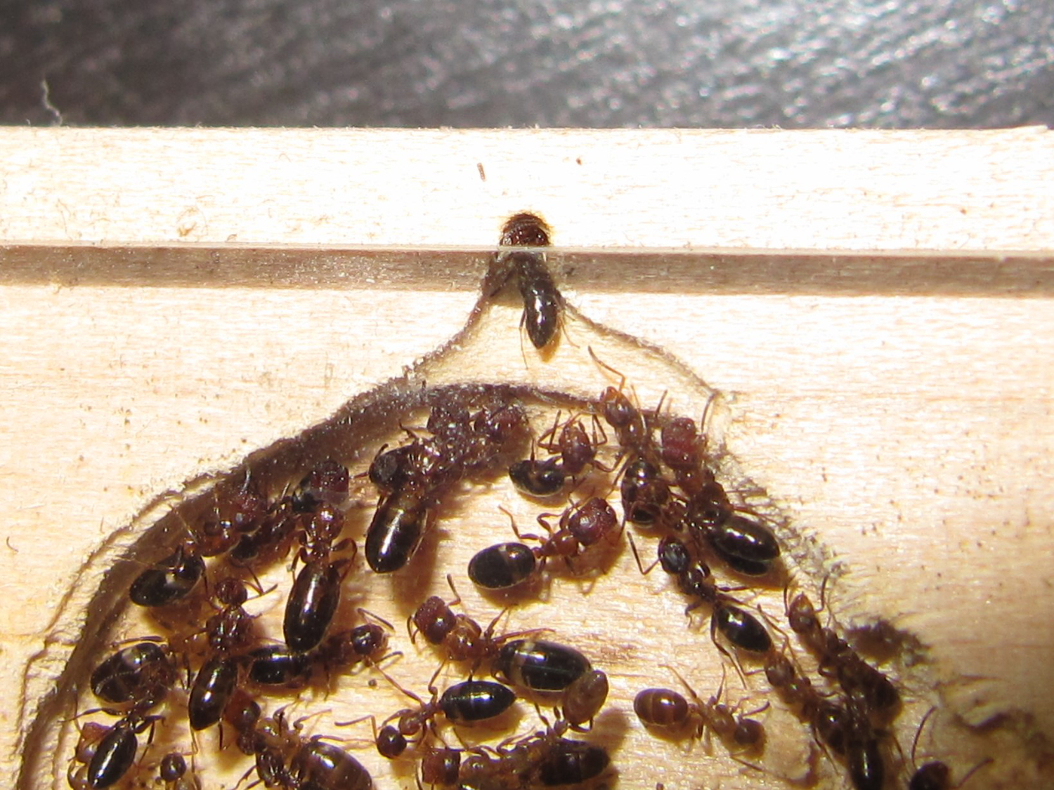 Wobei, das sehr zurückhaltend. Die Arbeiterinnen haben sich seitlich einen kleinen Ausgang ins Holz gefressen. Dieser wird natürlich - wie es sich für Stöpselkopfameisen gehört - seriös von einer Soldatin bewacht bzw. verstopft. Bisher konnte ich nur eine einzige Ausbrecherin ausmachen, der grösste Teil der Aussendienstlerinnen furagiert weiterhin im Formicarium...