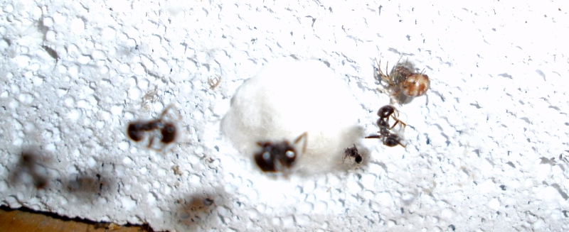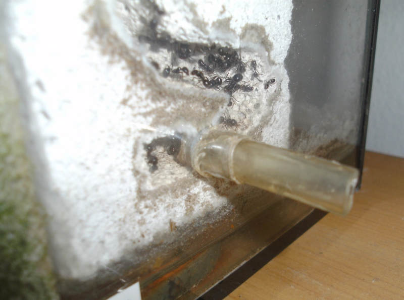 Nachdem der Weg nach draußen offen stand, sind die klugen Ameisen wohl gleich auf die Suche nach was auch immer gegangen - gefunden haben sie das Formicarium meiner Formica fusca Kolonie. Dieser Feind war zu nahe, das Nest nur einige cm vom eigenen weg, und musste vernichtet werden. Ich weiß nicht, was der erste Angriffspunkt war - ich vermute stark, das Nest, das scheinbar bombensicher für Formica fusca war, aber die kleineren Lasius niger Arbeiterinnen fanden einen Weg hinein.