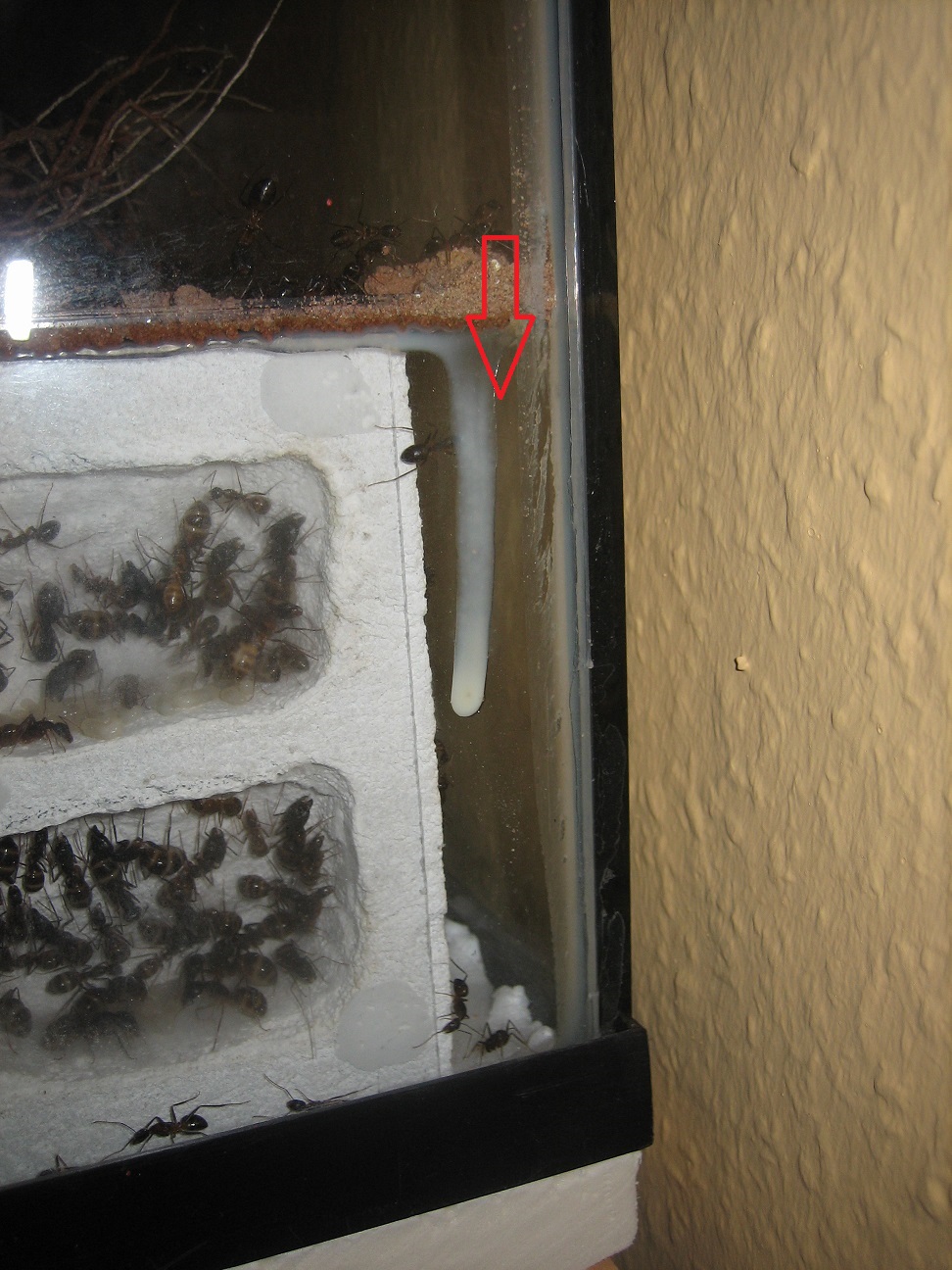 Allerdings haben die Arbeiterinnen es geschafft, den Kleber und vmtl. auch die Silikonwulst in der Ecke des Beckens abzunagen und sind durch ein kleines Loch in den unteren Bereich gelangt.