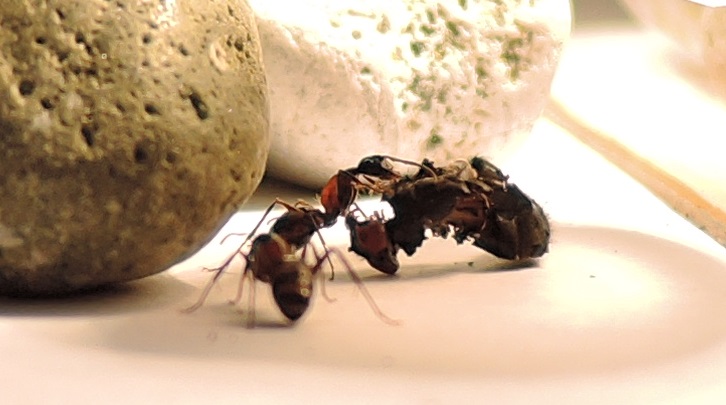 Damit die Ameisen es leichter beim Transport haben und ich nicht immer die Beine und Flügel entfernen muss, habe ich mir angewöhnt die Fliegen zu zerteilen und Beine sowie Flügel gleich zu entsorgen. So werden Kopf, Thorax und Abdomen getrennt angeboten.