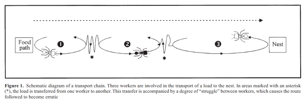 Ein Mechanismus für den kooperativen Lastentransport wurde bei der samenerntenden Ameise Messor barbarus entdeckt. Die Arbeiter arbeiteten nacheinander zusammen, übertrugen die Ladung von einem zum anderen und bildeten so eine Art Transportkette. Obwohl die meisten Arbeiter der Kolonie auch ohne Hilfe hätten Lasten transportieren können, wurde die Kooperation durch das Auftreten hoher Ladequoten in der Nähe der Nahrungsquelle ausgelöst. Der erste Arbeiter in einer solchen Kette war tendenziell klein oder mittelgroß, mit einem hohen Beladungsgrad, während der letzte größer war und einen entsprechend niedrigeren Beladungsgrad hatte. Diese Strategie war für die Kolonie von großem Vorteil, da sie die Zeit für den Transport zum Nest erheblich verkürzte. [..]