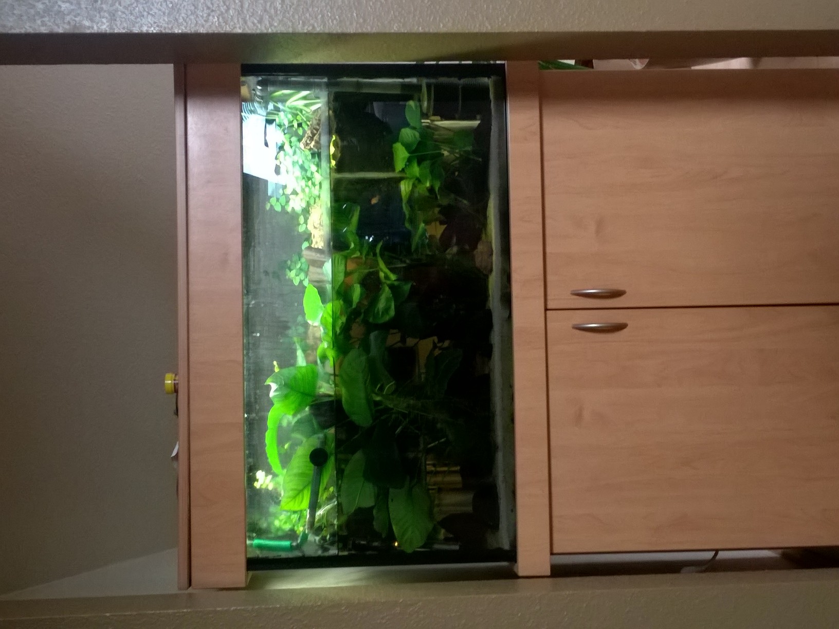 Ich würde das ganze gerne eher Tropisch mit vielen Pflanzen anlegen und an der Rückwand ein alten Baumstumpf bearbeiten für eine Nest. Das würde ich an die Rückwand stellen und von außen eine Wärmematte.