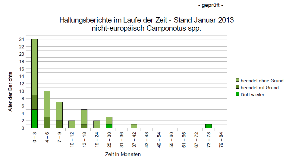die Behauptung bezüglich der erfolgreicheren Haltung von nicht europäischen Arten gegenüber europäischen ist nicht belegt. Es wird aber deutlich hervorgehobener von jenen berichtet. Jedoch hat die Auszählung der Haltungsdauer anhand der Haltungsberichte ergeben, dass die meisten Ameisenvölker (>80%) innerhalb der ersten 36 Monate eingehen, oder die Haltungsberichte innerhalb des Zeitraums abbrechen. Mehr als 25% innerhalb der ersten sechs Monate. Die Frage ist also, wieviel Euro man in das Risiko investieren will. Die Haltungsberichte können von jedem selbst ausgezählt werden, um die Zahlen zu prüfen.