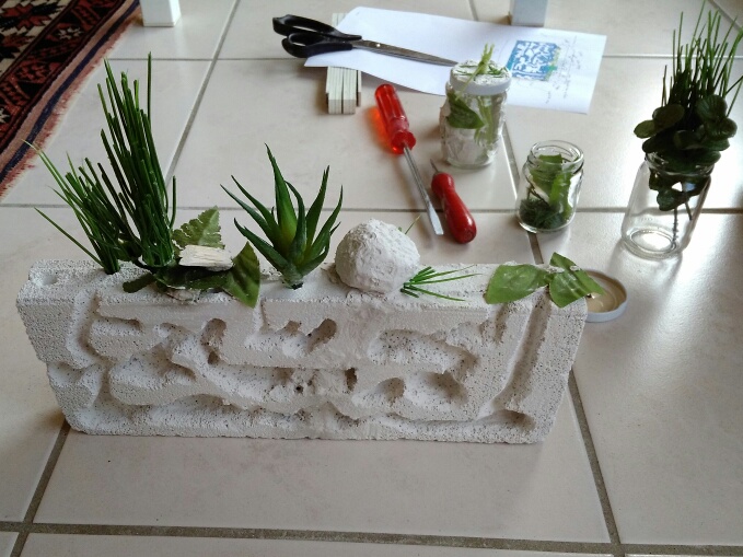 Ich hab dann noch Ytong und Gips wie auch ein wenig falsches Gras aus dem Baumarkt geholt und bereits folgendes gebastelt (siehe Fotos).