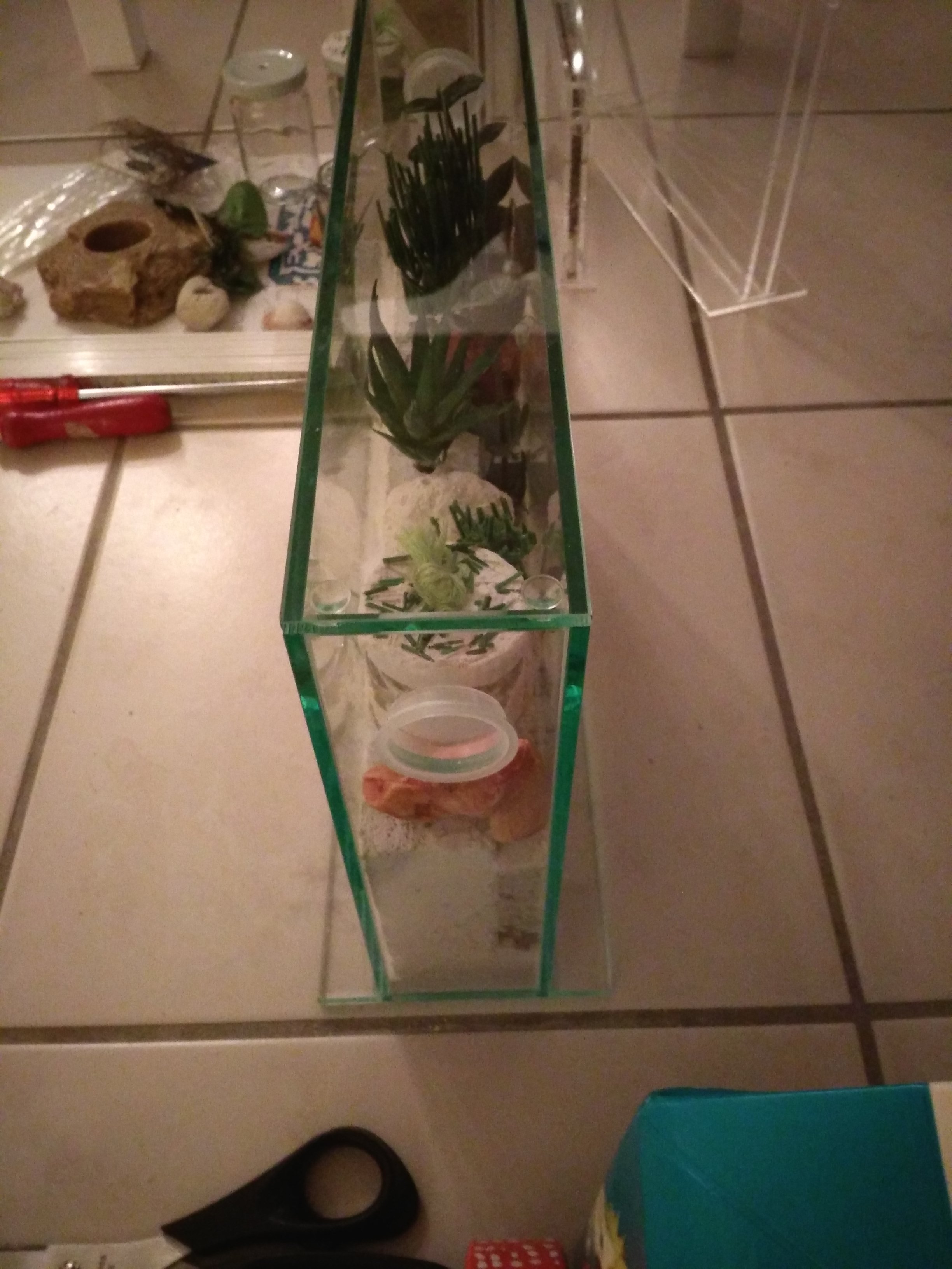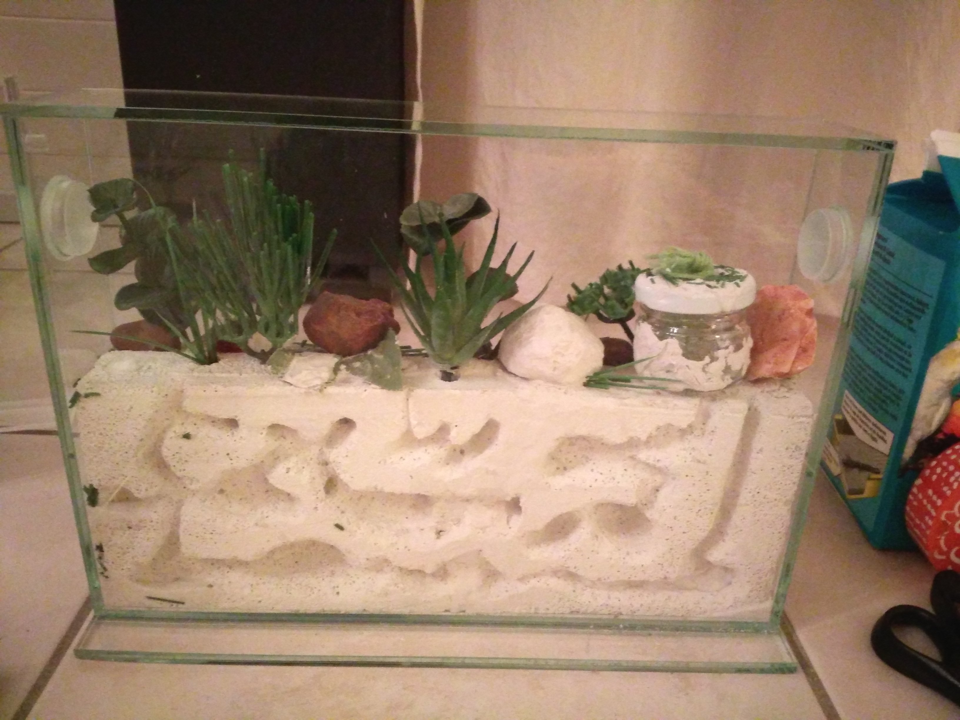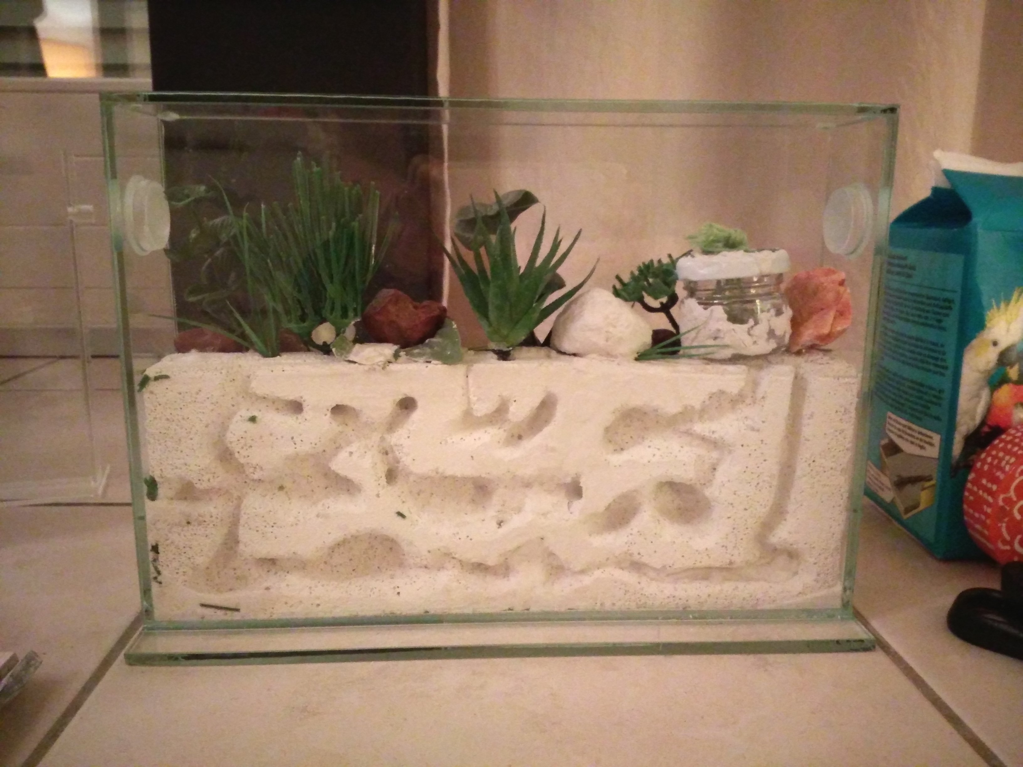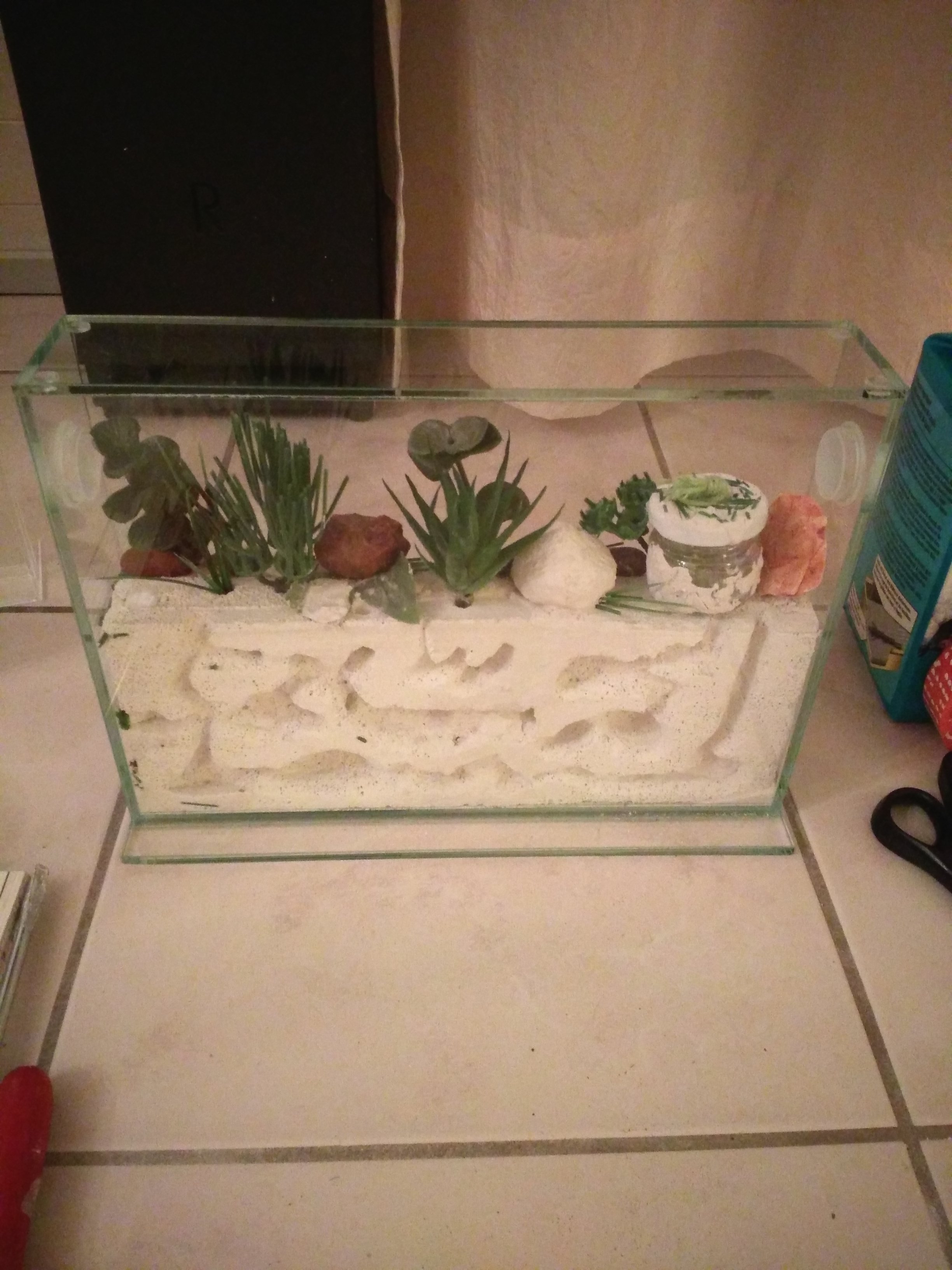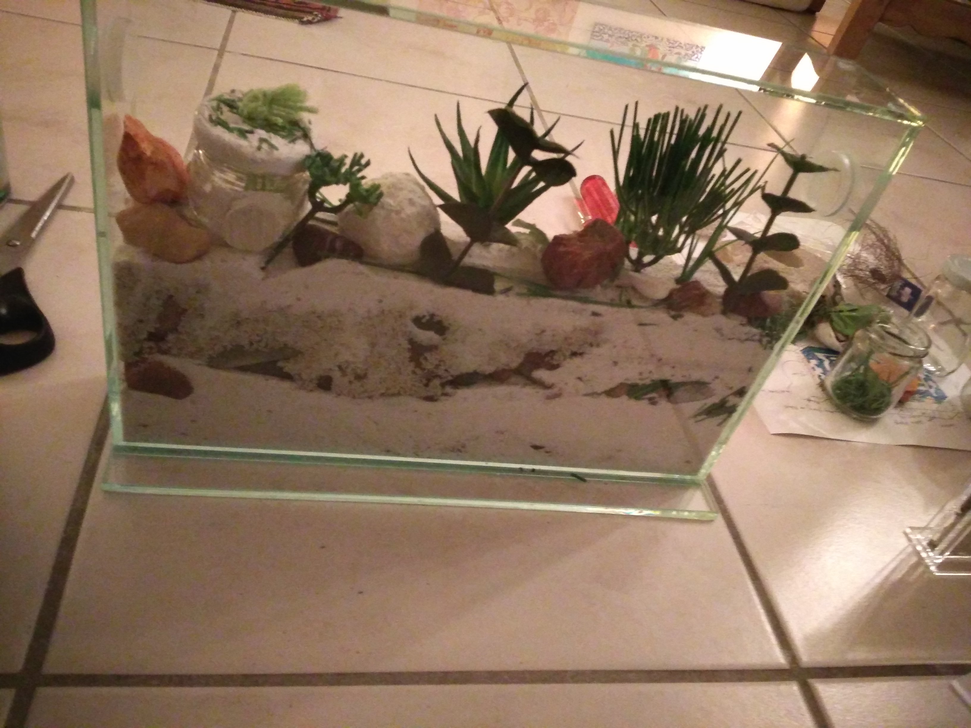 Sieht doch schon sehr gut aus. Du musst aber auch mit den Kunstpflanzen beschten, dass sie diese nicht als Kletterhilfe zum Ausbruch nutzen können. Immerhin wird das ja schon hoch.