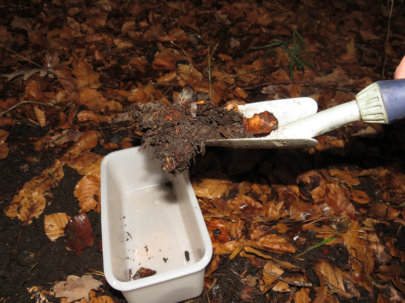 1. Man nimmt mit einer kleinen Gartenschaufel etwas Laub und Waldboden, einige cm feuchte Erde aus dem Garten oder einem Pflanzentopf, gut geeignet sind auch am Boden liegende Pflanzenreste und Moospolster.