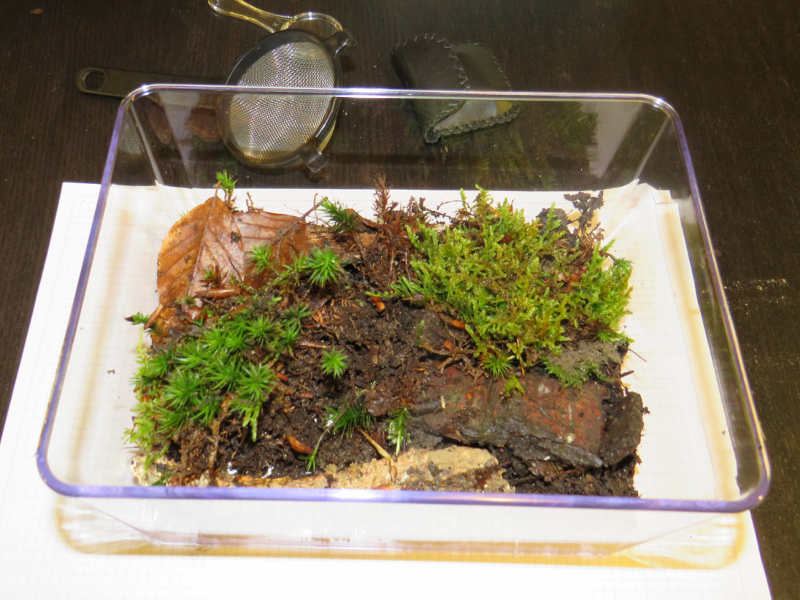 2. Man verteilt das gesammelte Substrat gleichmässig am Boden in einer beliebigen Plastikdose mit passendem Deckel. Meistens kann man in diesem Moment bereits einige andere Bodenbewohner erkennen. Die Grossen, wie Asseln, Spinnen,Würmer oder Tausendfüssler kann man mit der Federpinzette entfernen und frei lassen.