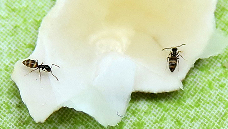 Versuchsweise habe ich mal ein winziges Tröpfchen Honig auf ein Stückchen Schale vom Frühstücksei angeboten: Bald