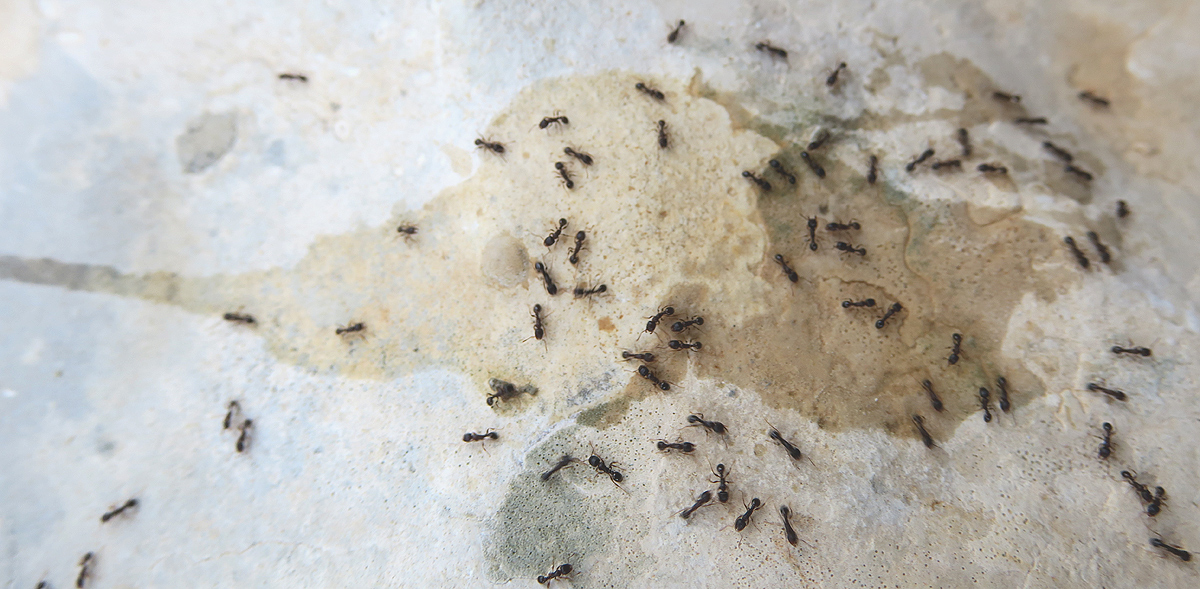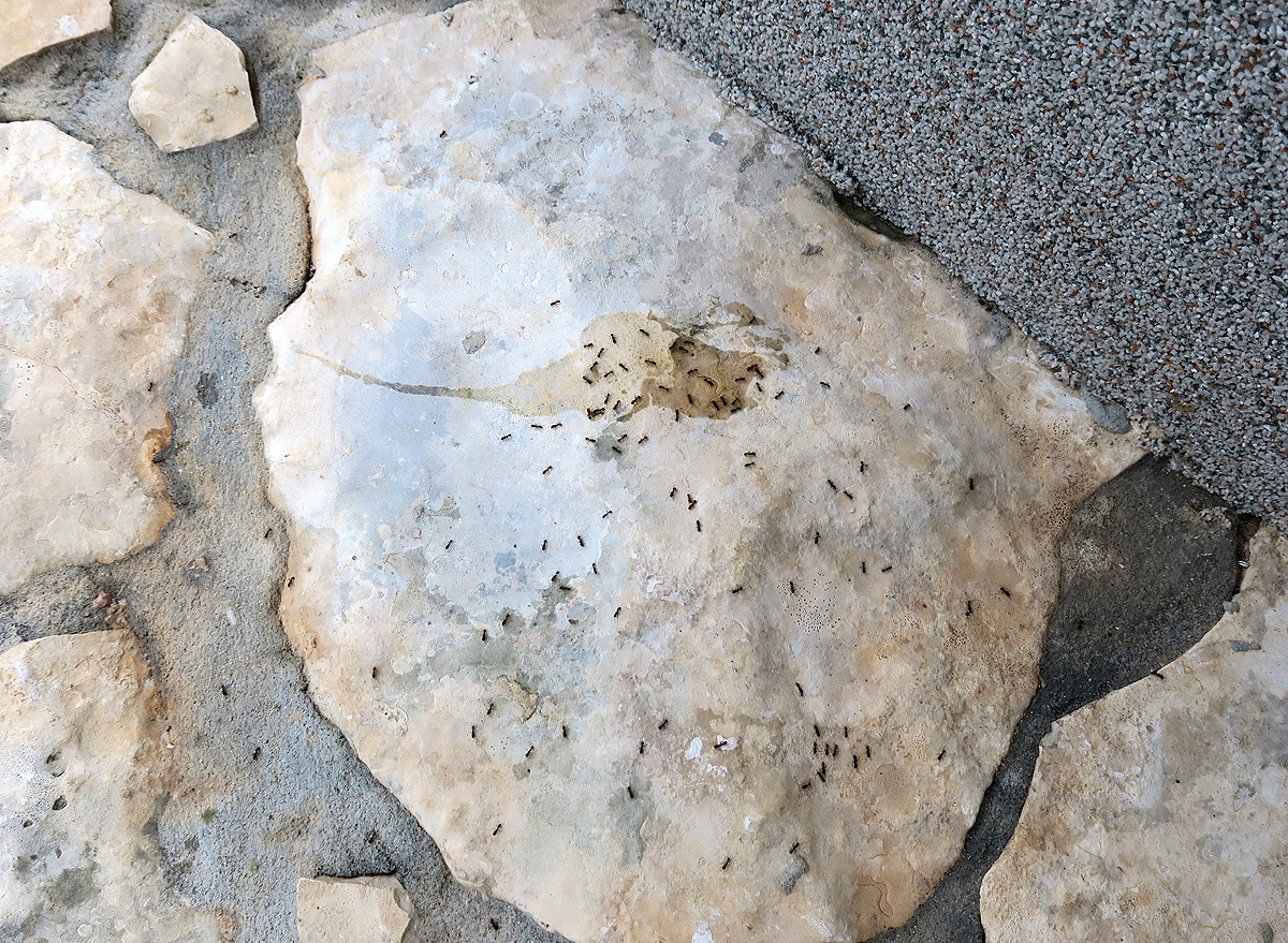 Hier verschwinden die Ameisen durch Risse in der Mauer unter dem Betondach. In der Umgebung besuchen sie Pflanzenläuse.