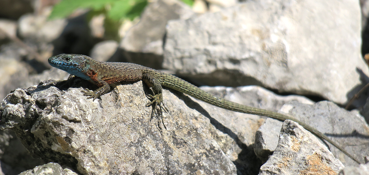 Eindrucksvoll ist Algyroides nigropunctatus, die Prachtkieleidechse: