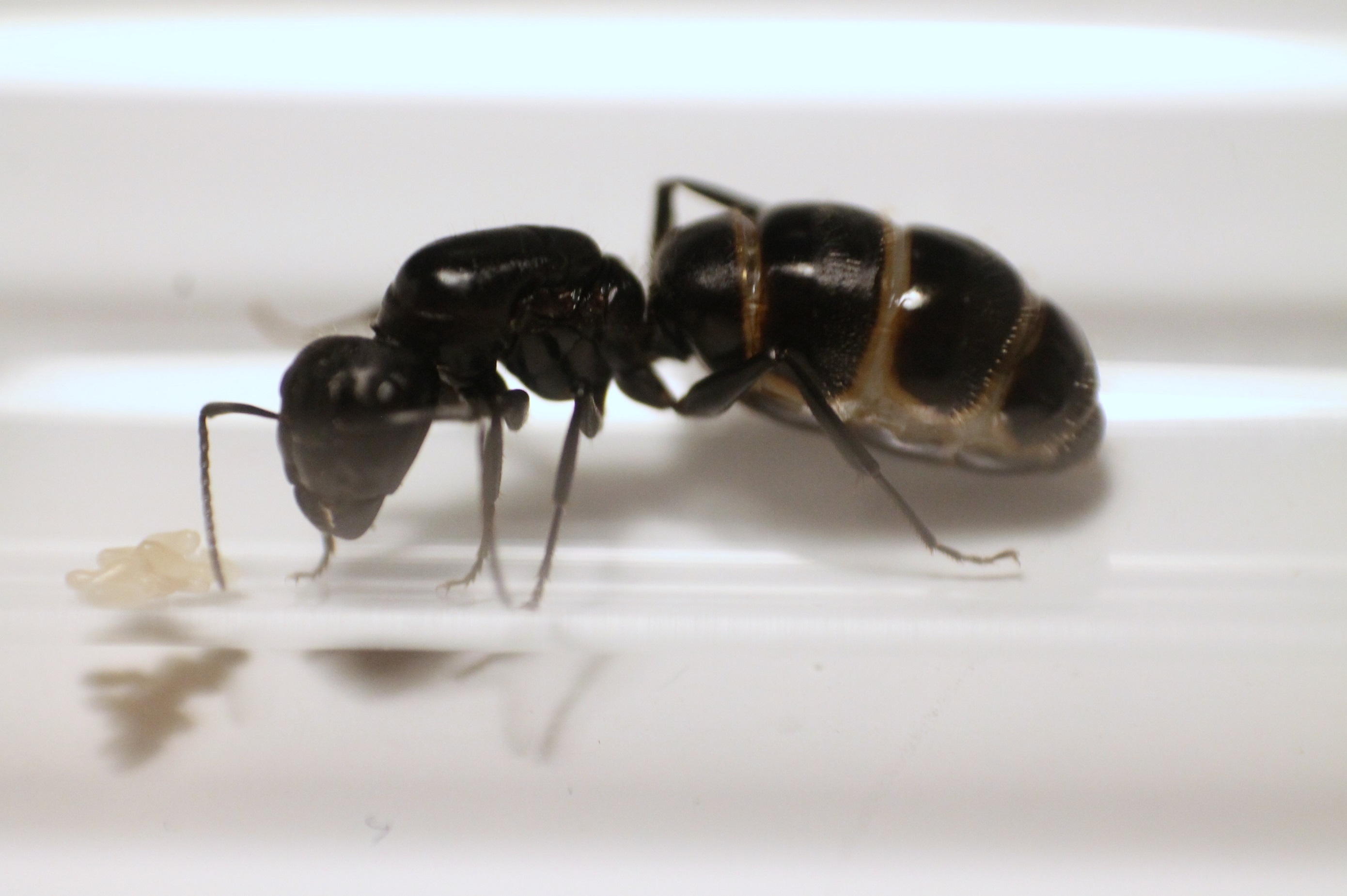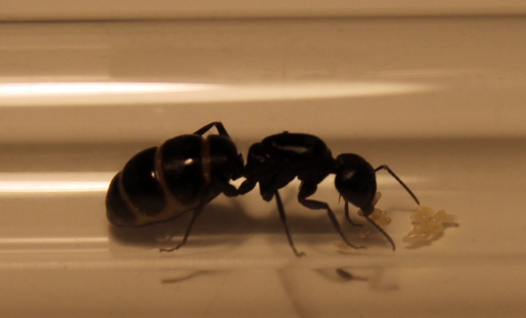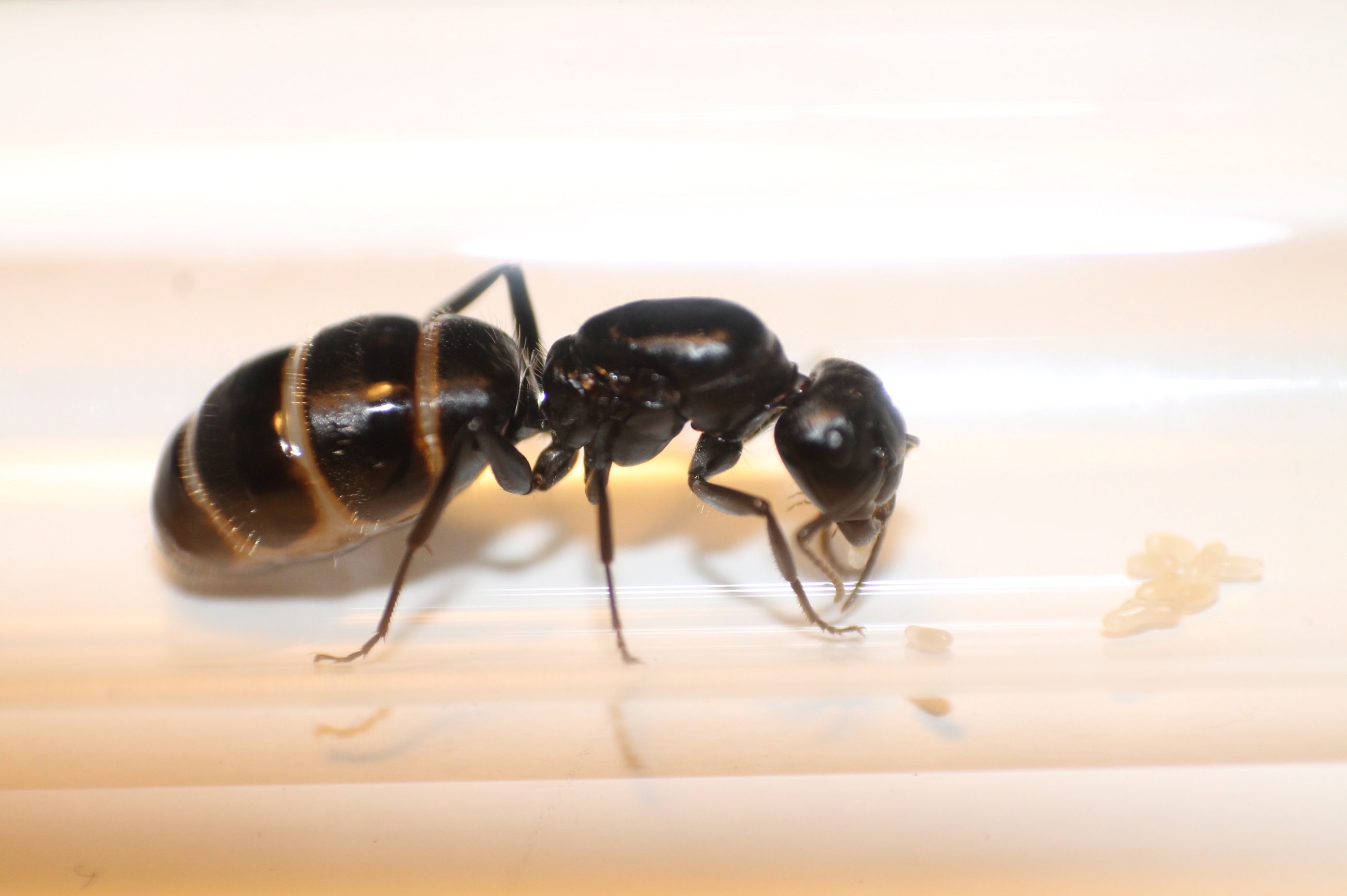 Sie befindet sich seit über einem Monat nun bei mir und hat über 15 wirklich große Eier gelegt. Diese hat sie schon ziemlich lange, vermutlich seit über zwei Wochen, wobei natürlich weitere Eier dazukamen. Da mir diese Entwicklungszeit selbst für eine große Cmaponotus schon relativ lang vorkam, halte ich sie seit einiges Tagen wärmer. Der Sommer in Aachen lässt bisweilen zu wünschen übrig und ohne eingeschaltete Heizung herrschen hier momentan Raumtemperaturen von 19-20°C; für eine Gyne, die in Südeuropa geschwärmt ist, wohl eher zu kalt. Sie nimmt die Wärme gut an und bringt die Brut an die wärmste Stelle des RGs. Ich hoffe daher, dass bald die ersten Larven schlüpfen werden. Generell habe ich mich auf eine langsame Entwicklung durchaus eingestellt und sie soll sich die Zeit nehmen, die sie braucht.