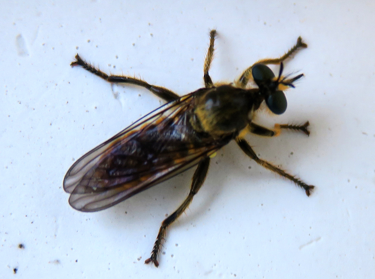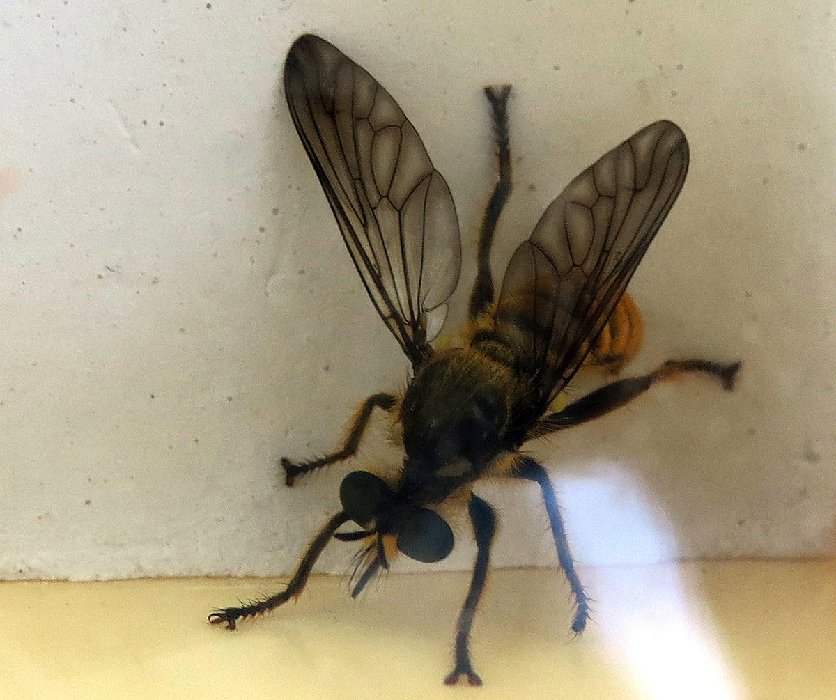 aber dann hat es die Maschine angeworfen und war weg… Klar war es eine Raubfliege, mit etwas Ähnlichkeit zu Wespen. Die Internet-Suche ergab: