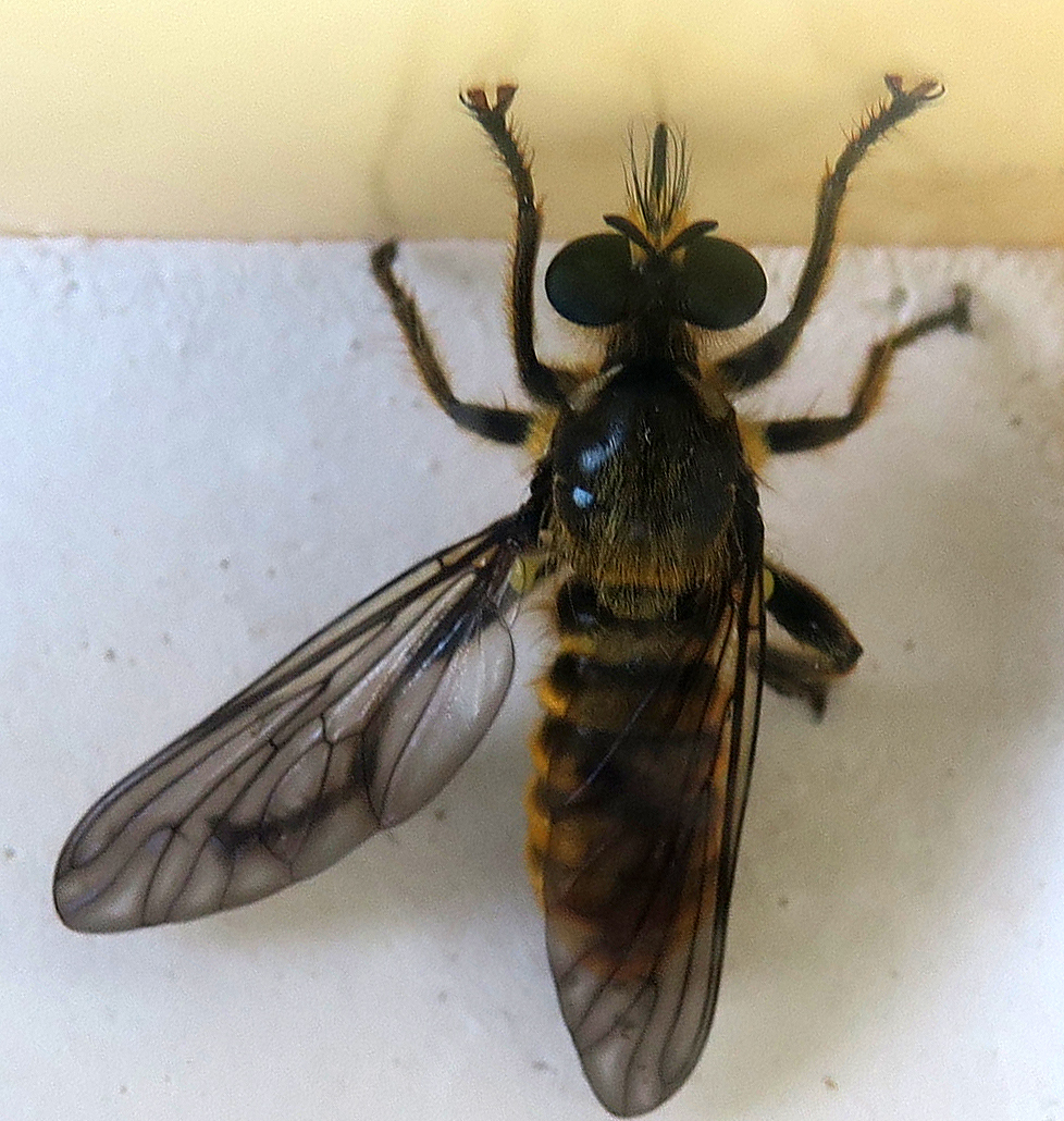 Die Mordfliege Choerades cf. fimbriata. https://de.wikipedia.org/wiki/Choerades_fimbriata , eine räuberische Fliege, die gerne andere Fliegen fängt,
