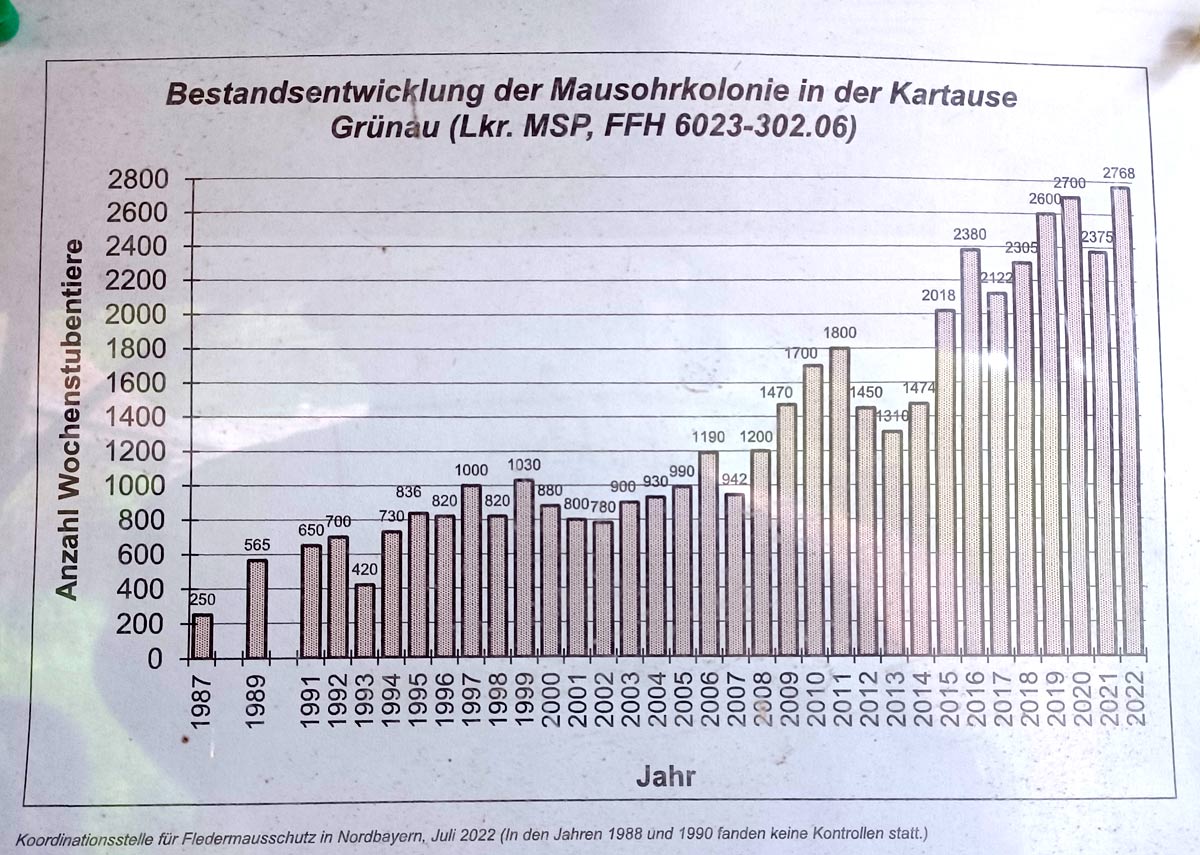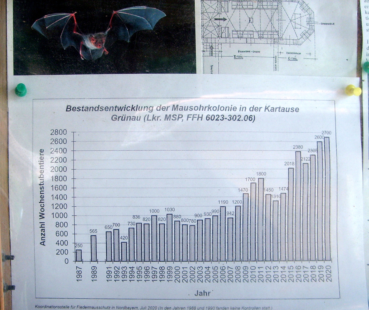 In einem Gebäude der Kartause Grünau bei Schollbrunn im Spessart wird seit Jahren die Entwicklung einer Population der Großen Mausohr-Fledermaus
