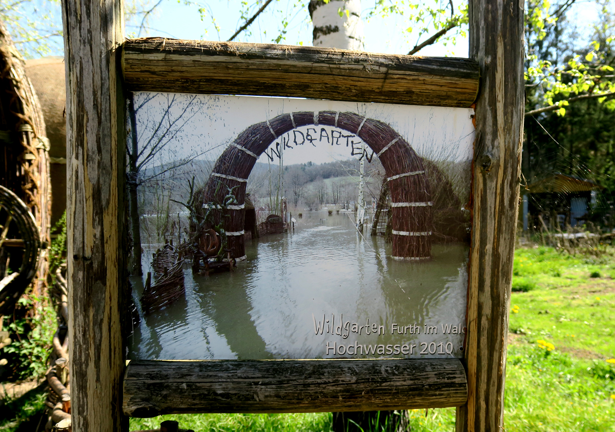 Am Eingang durch das im Bild gezeigte Weidentor empfängt uns ein Foto von einem Hochwasser in 2010. Es ist also ein Feuchtgebiet, zurzeit allerdings trockenen Fußes zu begehen.