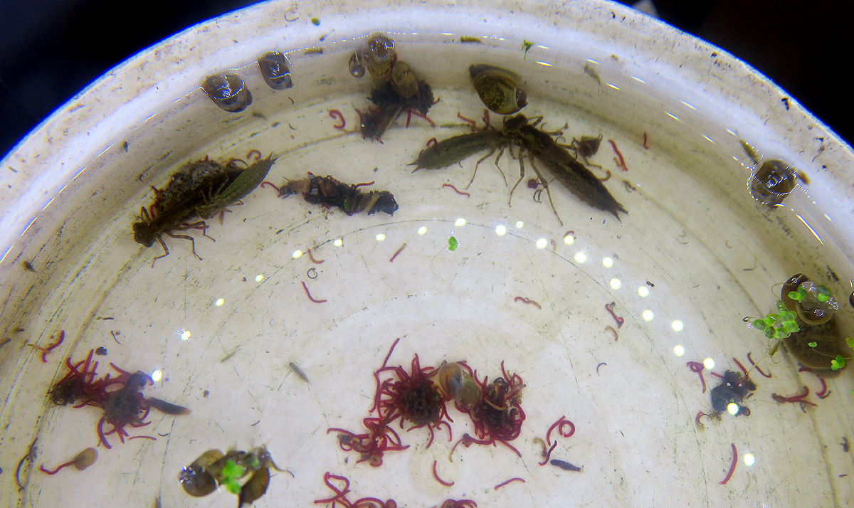 kleine Lebensformen aus dem Gewässer unter einer großen Lupe zu besichtigen sind: Libellenlarven, Köcherfliegenlarven, Schlammschnecken, rote Mückenlarven etc..