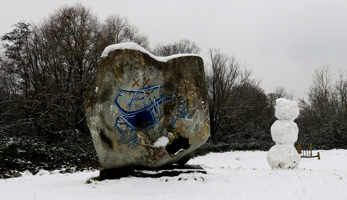 Der Klotz ist ein Hohlkörper, wie man an dem Loch erkennen kann, das bald größer werden dürfte; die Graffiti werden der Witterung nicht lange widerstehen, und der