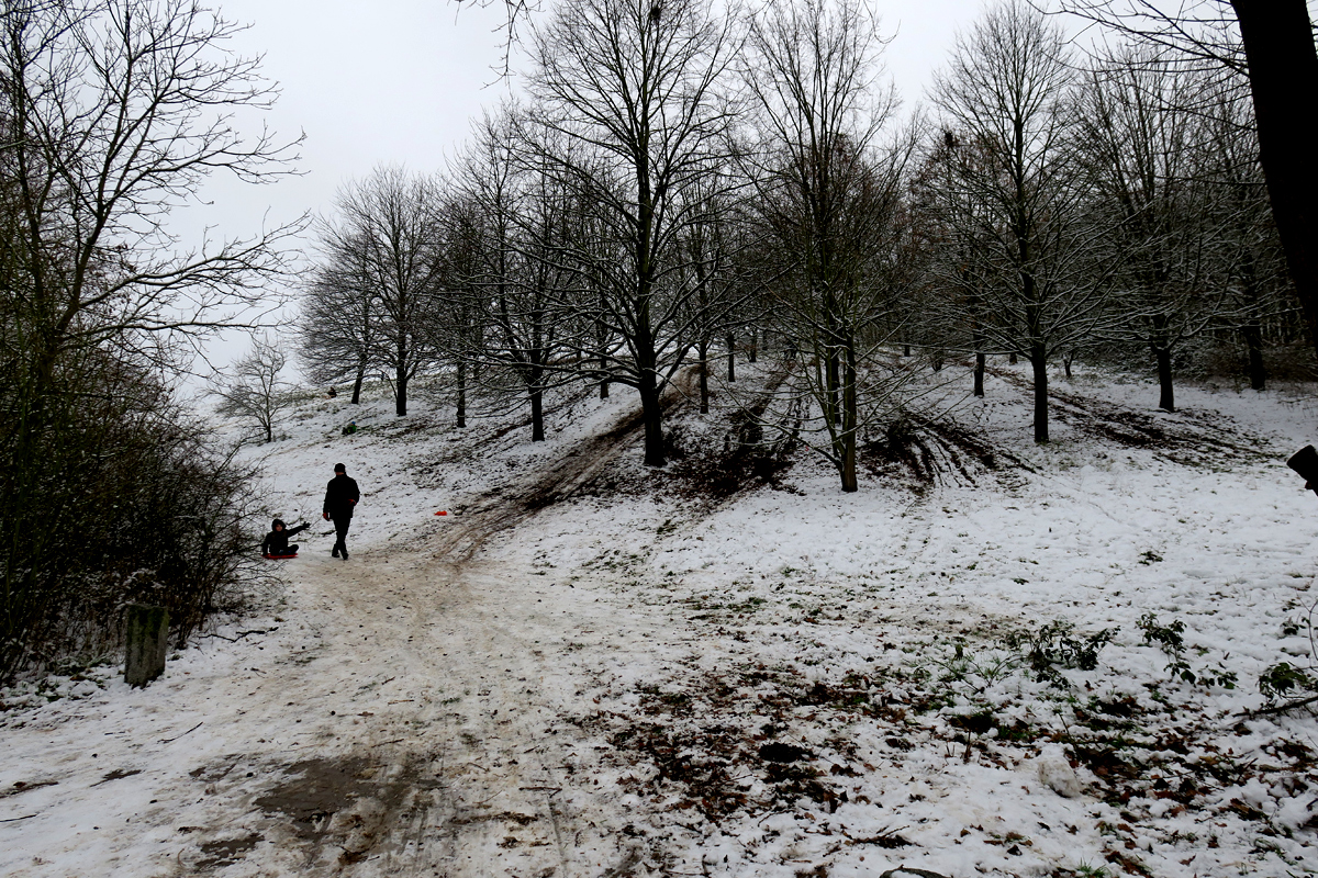 zahllose Kinder im selten gewordenen Schnee tummelten. Ein paar kleinere und größere Hänge boten die mittlerweile seltene Gelegenheit zum Schlittenfahren!