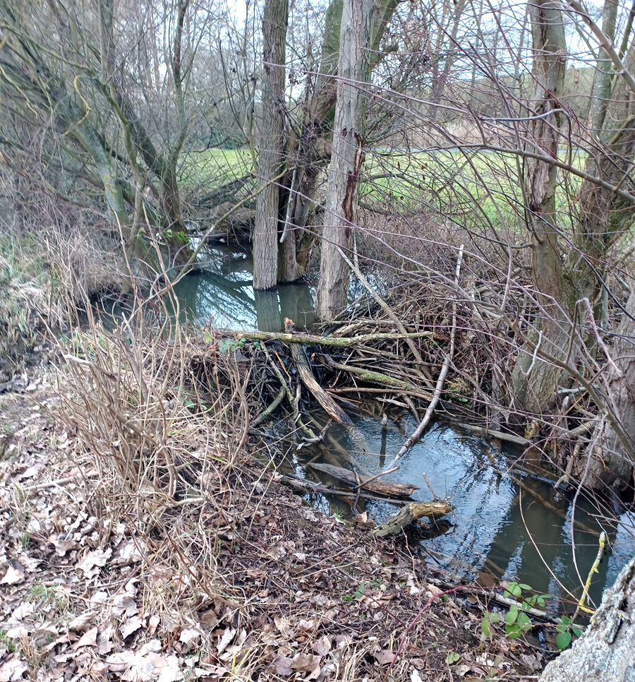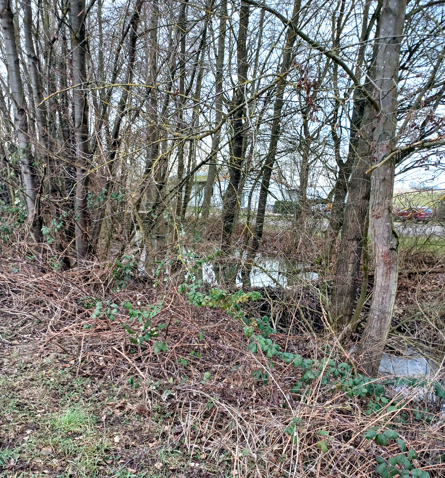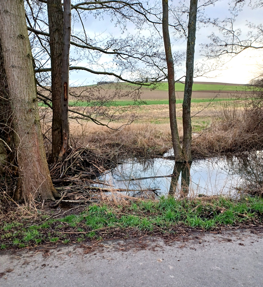 Auf einer Strecke von knapp 1 km verläuft der Bach weitgehend begradigt und zum Teil direkt neben einem geteerten Feldweg. Schon aus der Ferne waren überflutete Flächen in Feuchtwiesen und Ufergehölz zu sehen.