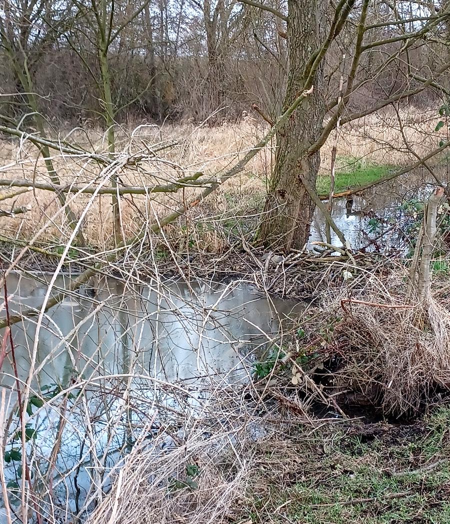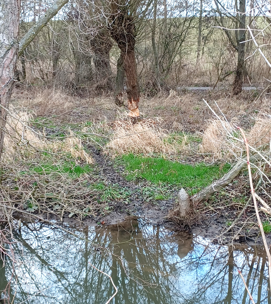 Wir haben unbedingt vor, in ein paar Wochen zur Laichzeit von Erdkröten und Fröschen den Bach nochmals abzugehen. Auch wenn rechts und links der schmalen Bachaue gleich Äcker anschließen, könnten die Biber hier einen neuen Lebensraum für Amphibien gestaltet haben. Auch an Vögeln ist wohl einiges zu erwarten, und mehrere dicke, alte und morsche Weidenstämme sehen sehr nach Lasius fuliginosus aus. Eine erfreuliche Entwicklung, Bio-Renaturalisierung!