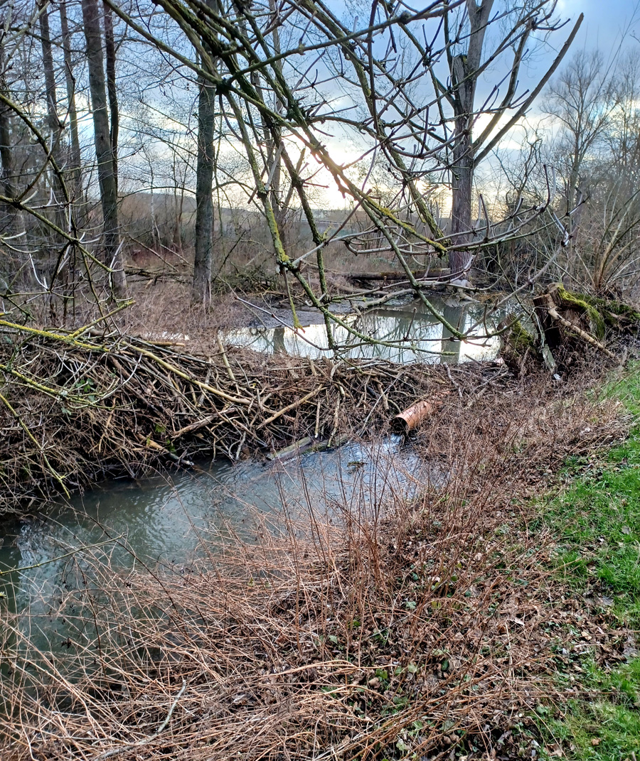 Der 10. Damm neben dem Schützenhaus. Hier hat man ein Rohr durch den Damm geschoben um ein weiteres Ansteigen des Staus zu verhindern.