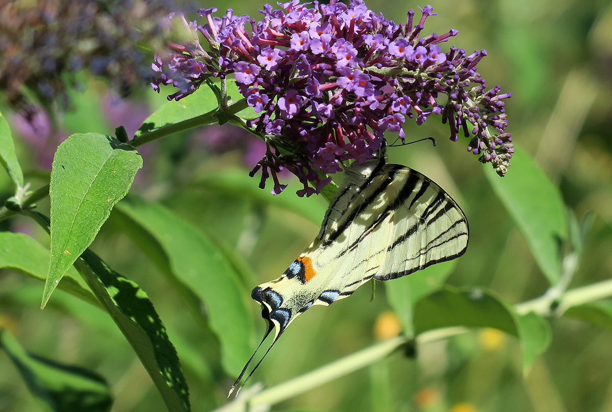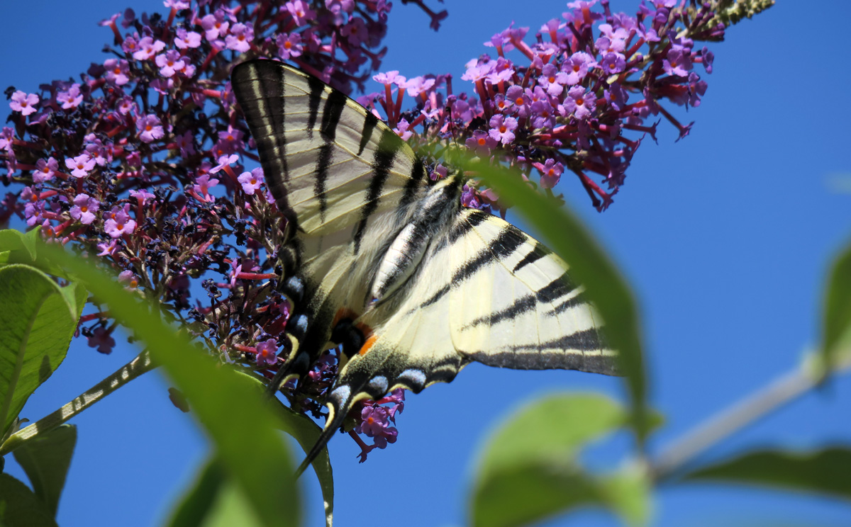 Der Segelfalter (Iphiclides podalirius) ist eigentlich auf den Trockenrasen bei Karlstadt am sichersten zu beobachten, obwohl auch dort selten. Jetzt sahen wir gleich zwei in der Stadt Würzburg, und weitere zwei auf dem WE-Grundstück: