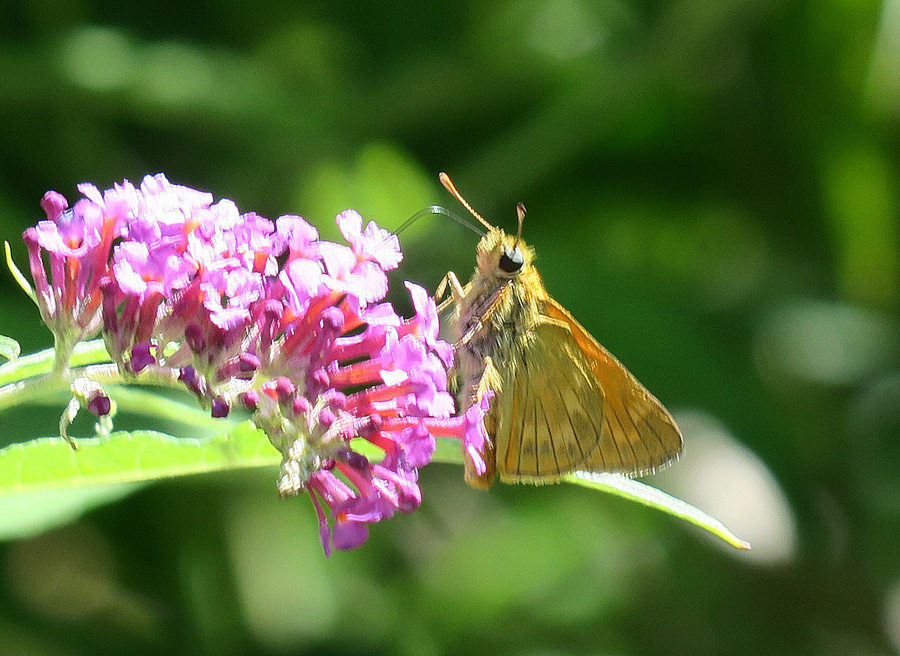 Das recht verwilderte Obstanbaugebiet an den Mainhängen südlich von Würzburg war hier im Forum schon mehrfach erwähnt. Jetzt blühte dort auf dem WE-Grundstück ein großer Strauch des Sommerflieders (Buddleia sp.), der von zahllosen Schmetterlingen umschwärmt war! Mit etwas Geduld (und vielen „Fehlschüssen“) gelangen einige hübsche Bilder.