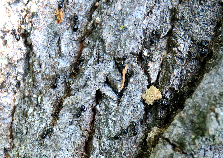 Arbeiterinnen tragen Holzteilchen aus der Baumkrone nach unten!