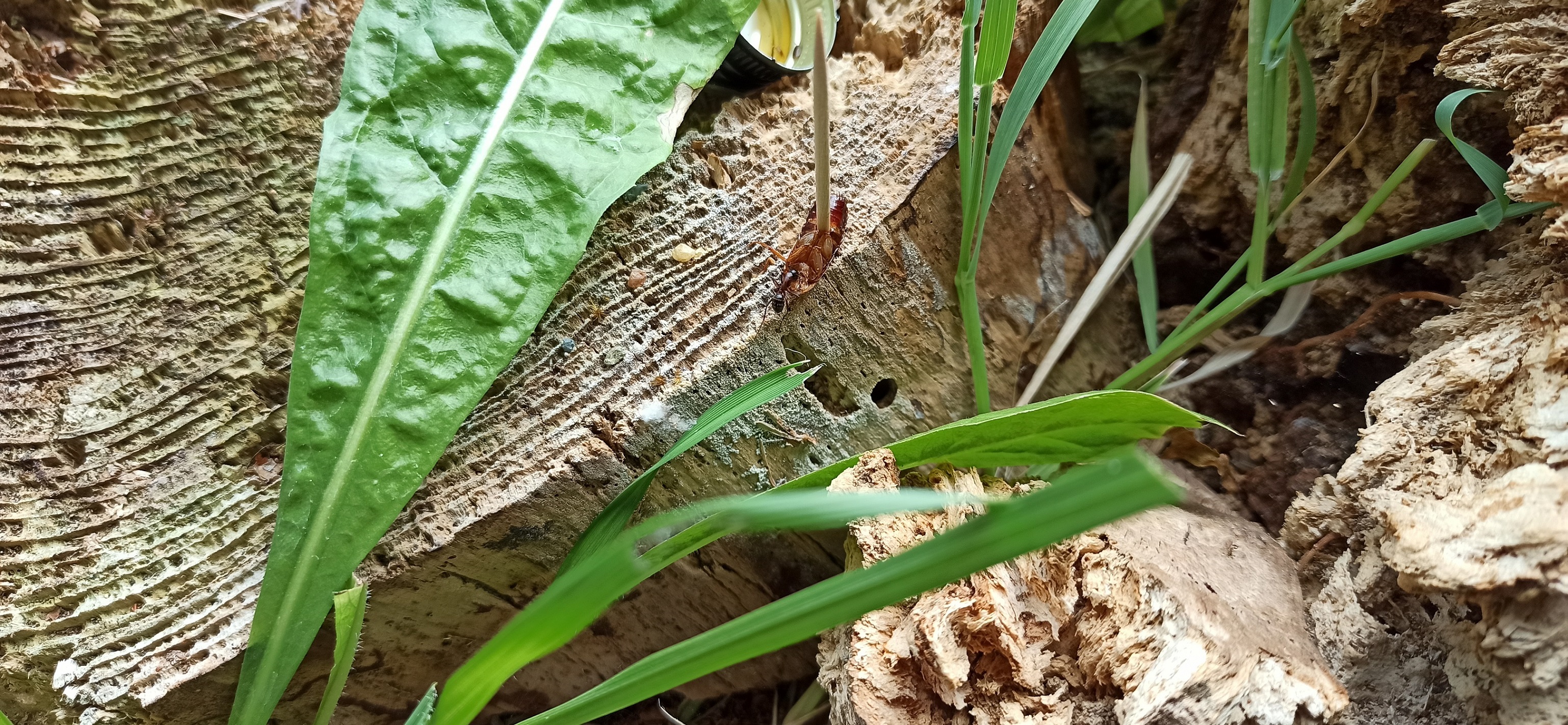 Als Erdteil dient ein Gemisch aus Sand, Lehm und Erde. Sand zum Strecken, Lehm für die Festigkeit und Erde für die Pflanzen. Das scheint sehr gut zu funktionieren. Auf den Bodengrund legte ich links die verrottende Holzscheibe und rechts den verwitterten Stumpf, der schon beim Transport fast auseinander fiel und einen eigenen Erdanteil aufweist. Beide Mitbringsel hatten erwartungsgemäß Bewohner: Springschwänze, Asseln, 2 Hundertfüßer, ein paar sehr kleine Spinnen die Netze bauen und viele ganz kleine Wesen, die ich einfach nicht ansatzweise einordnen kann. Dazu gehören auch diverse Milben usw. Ich habe alle am Leben gelassen und alle durften auch in das Formicarium. Meine Kolonie C. ligniperda, zu dem Zeitpunkt ca. 70 Tiere, wurde Zugang gewährt. Sie konnten sich den Zeitpunkt des Umzugs aussuchen. Zusätzlich habe ich noch Samen essbarer Gartenpflanzen eingestreut und natürlich auch diverse kleine Pflanzen aus dem Wald bekamen mit dem Umzug ihre Chance.