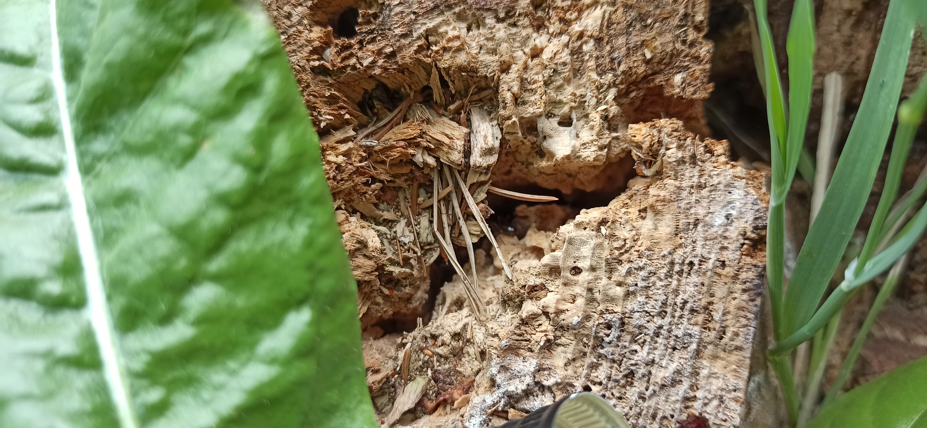 Bei Sonneneinstrahlung werden die C. ligniperda richtig schnell. Dann ist besonders der hoch aufragende Holzstamm ihr Revier. Außerhalb sehe ich keine Brut. Innerhalb gibt es jedoch sicherlich viele Hohlräume, entsprechenden Aushub kann ich ausmachen.