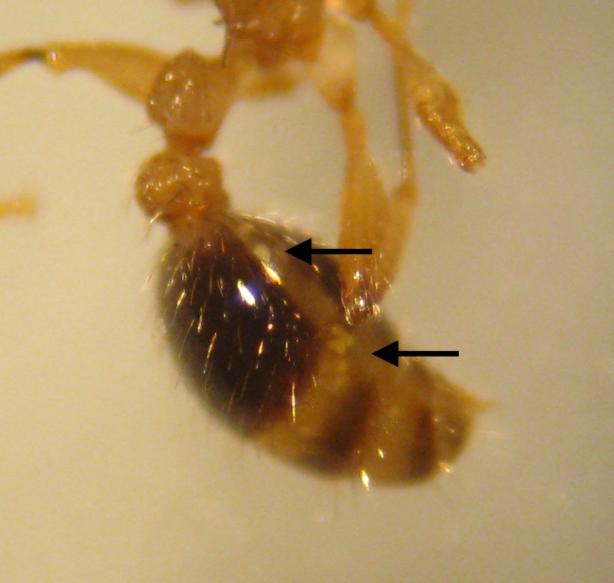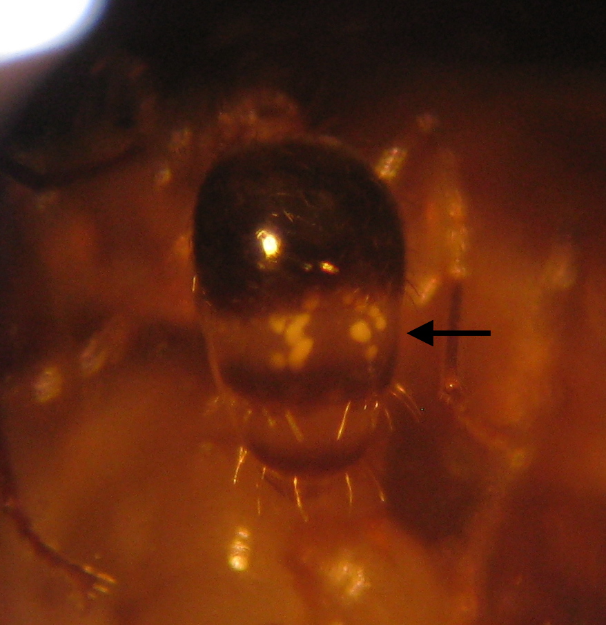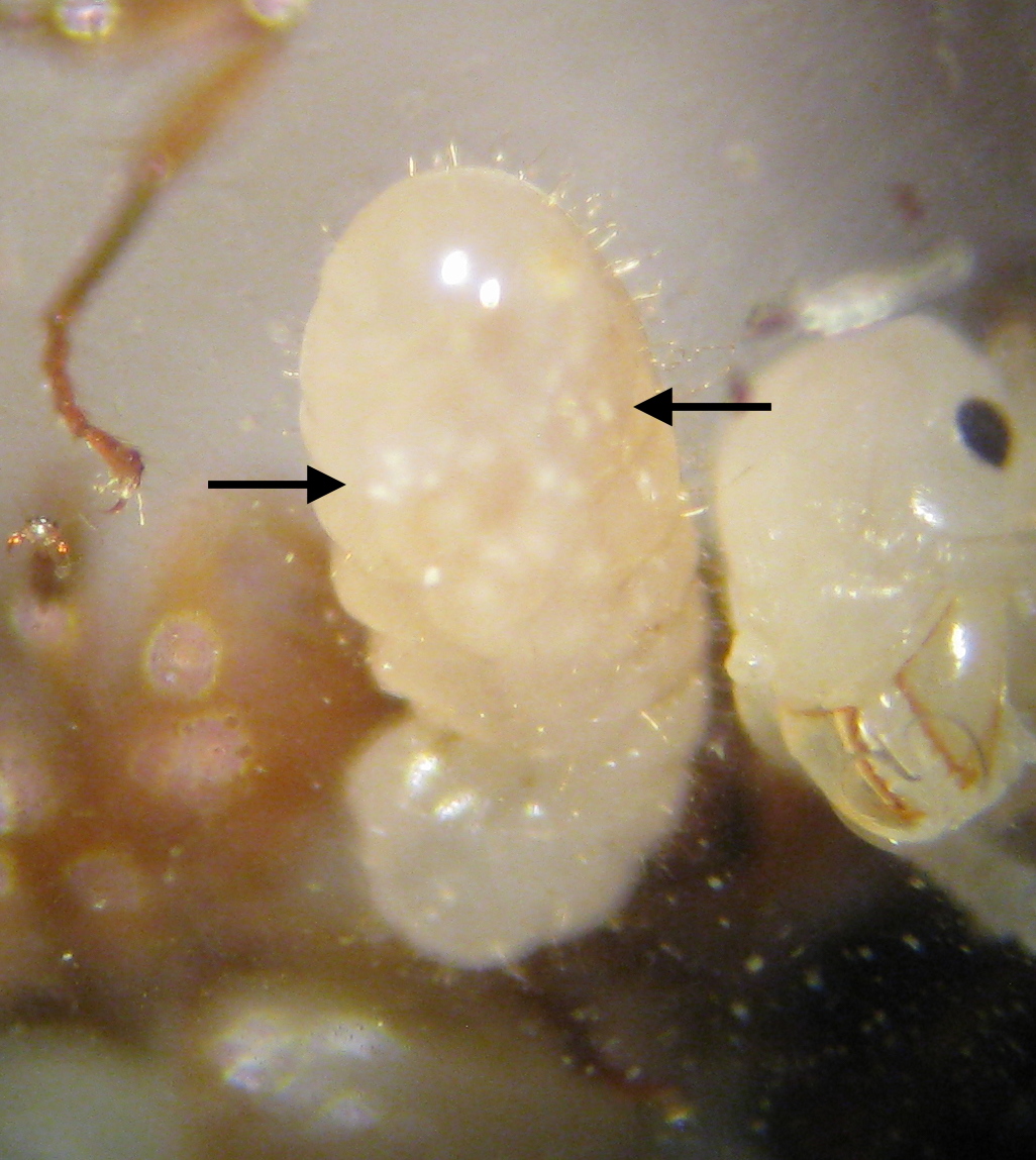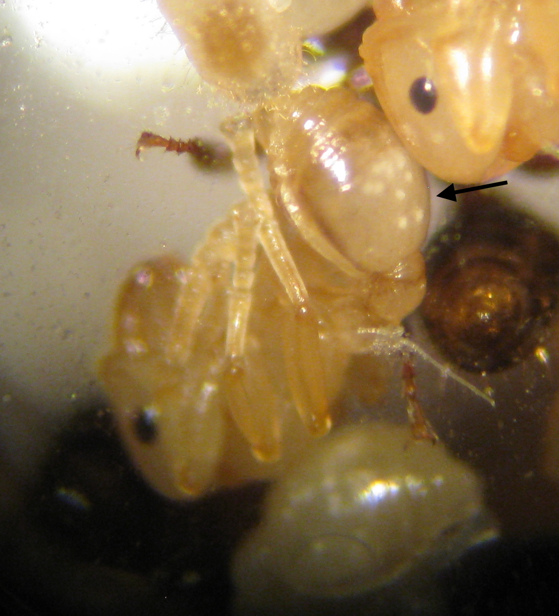 bei einer Tetramorium-Art konnte ich weiße “Punkte” bzw. Flecken in der Gaster von (hauptsächlich jungen) Arbeiterinnen und Puppen, sowie in Larven entdecken - siehe angehängte Fotos. Die Verfärbungen sind innerlich, wenn auch sehr nahe an der Oberfläche. Die Cuticula selbst ist unversehrt und an den betroffenen Stellen keinesfalls erhaben; um Ektoparasiten scheint es sich nicht zu handeln. Zu sehen sind die Flecken bei manchen, aber nicht allen, Larven, Puppen, sowie Arbeiterinnen. Innerhalb der Arbeiterinnenschaft treten sie vorrangig bei helleren, also wahrscheinlich jungen, noch nicht voll ausgefärbten Arbeiterinnen auf. Bei fouragierenden Arbeiterinnen, welche in der Regel ja älter sind, konnte ich die weißen Flecken bislang noch nicht beobachten. Bei Arbeiterinnen und Puppen sind die Flecken ausschließlich im Gaster festzustellen.