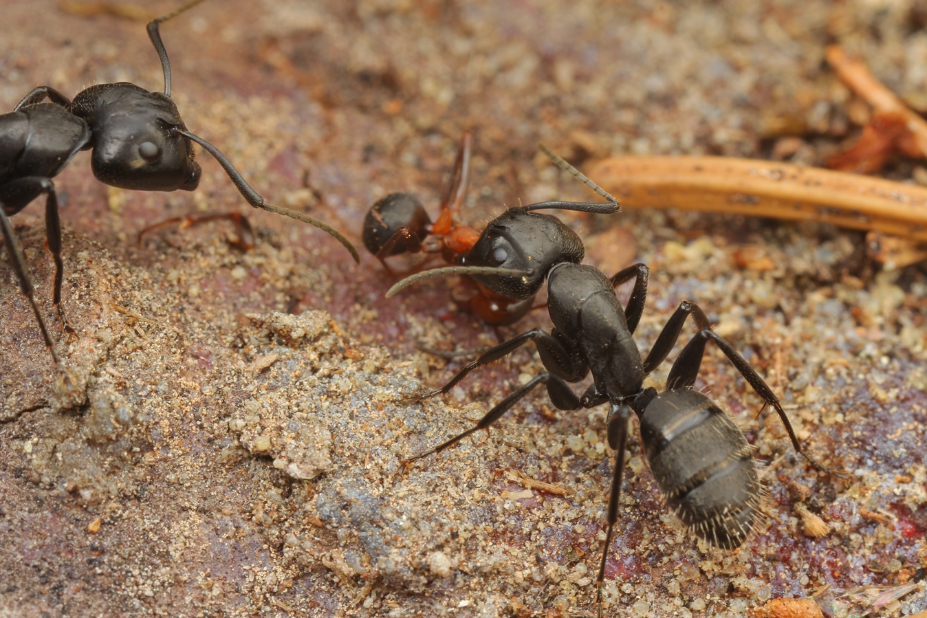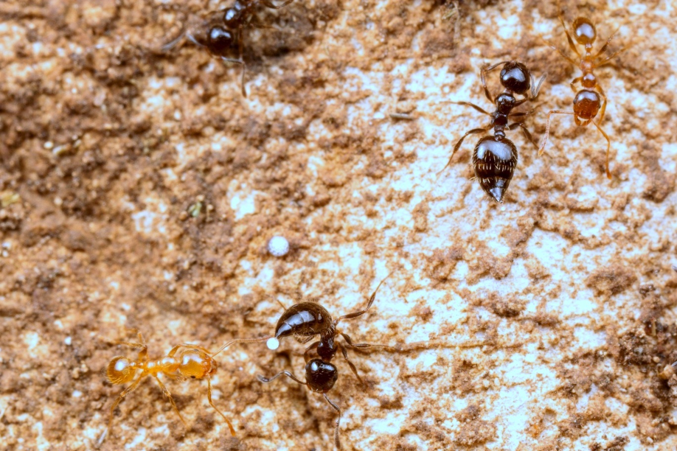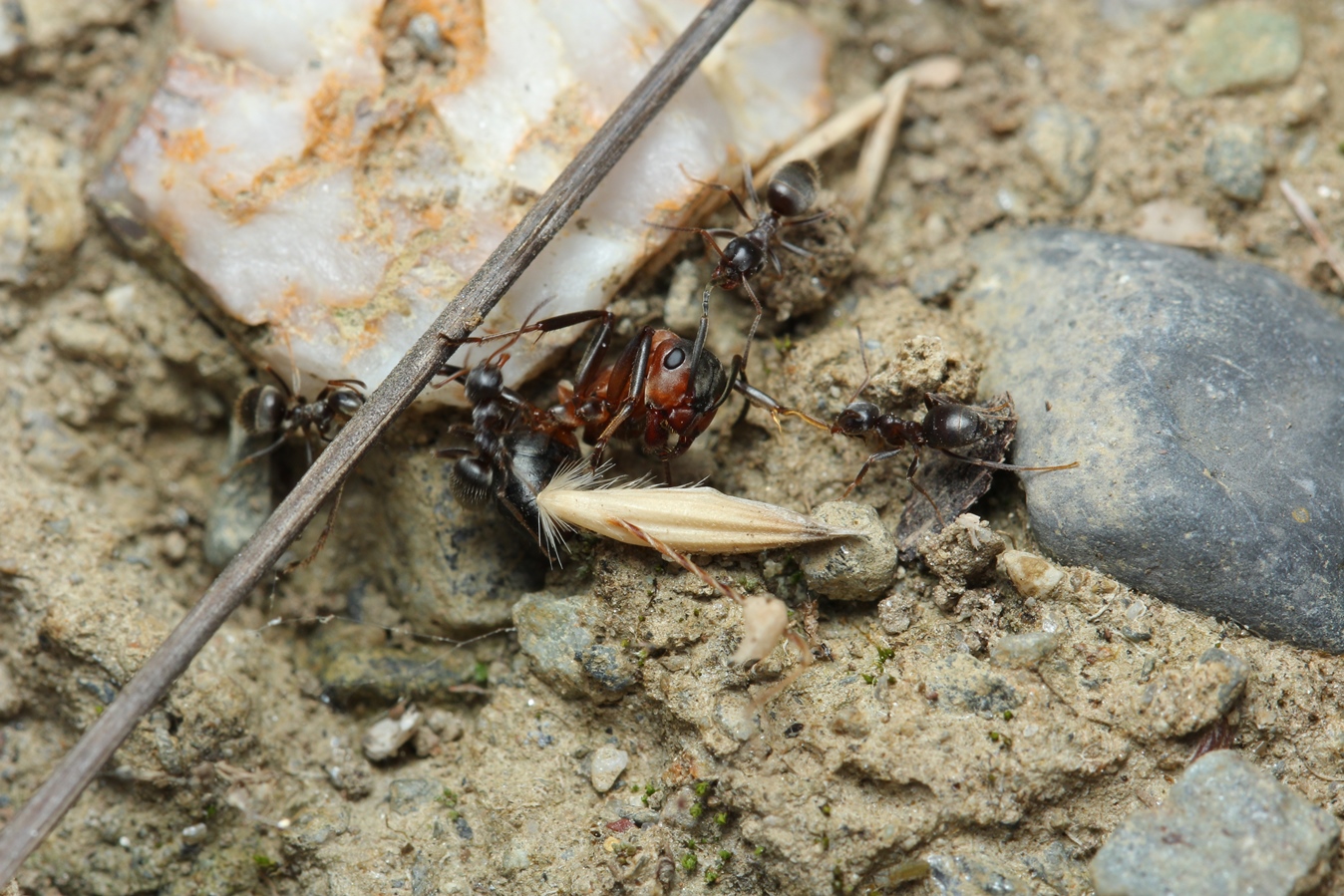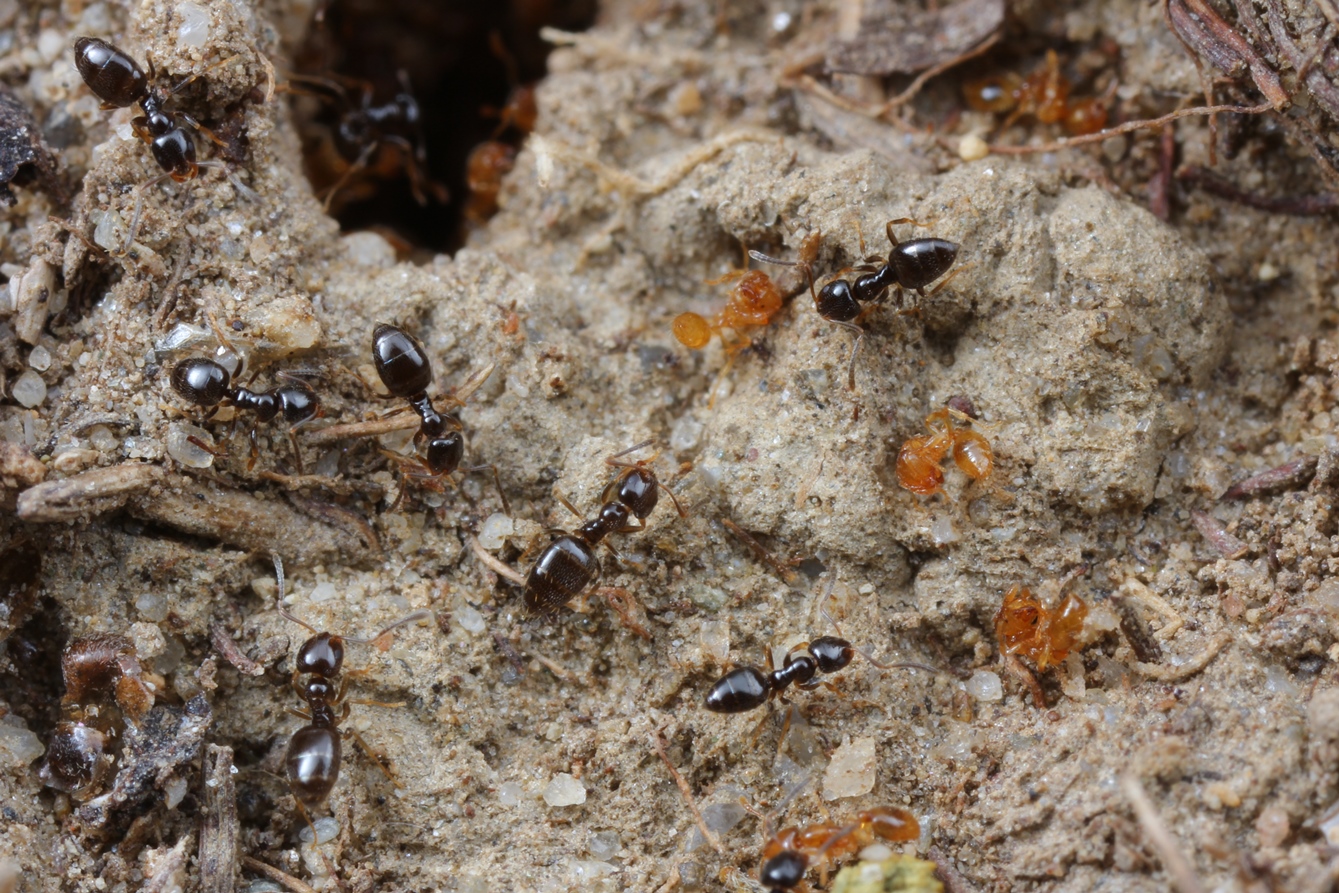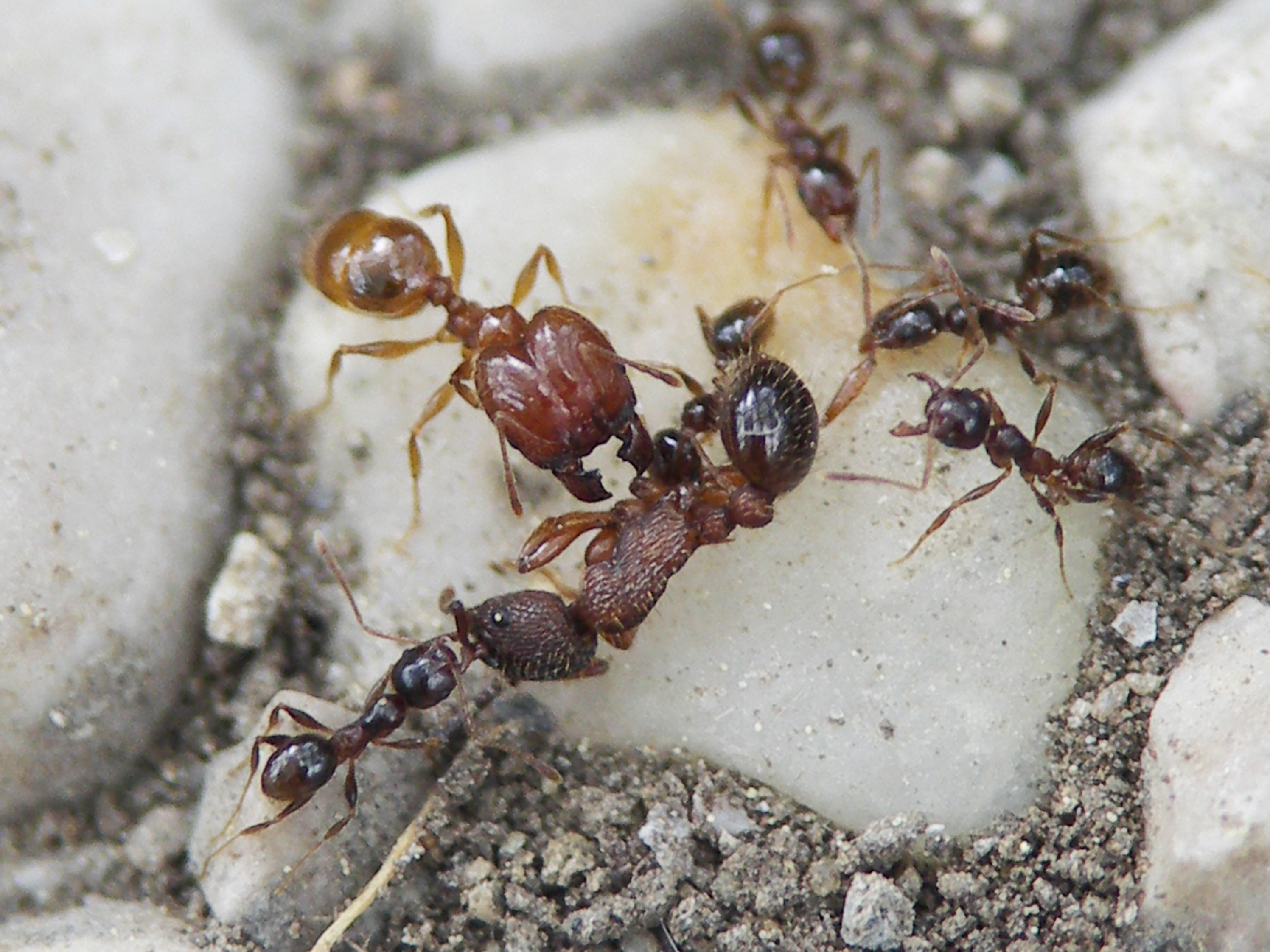 Solenopsis fugax vs. Plagiolepis cf. vindobonensis: Letztere setzt überraschend ein hochtoxisches Gifttröpfchen gegen den Gegner ein; in wenigen Sekunden liegt Solenopsis am Rücken und zappelt mit den Beinen