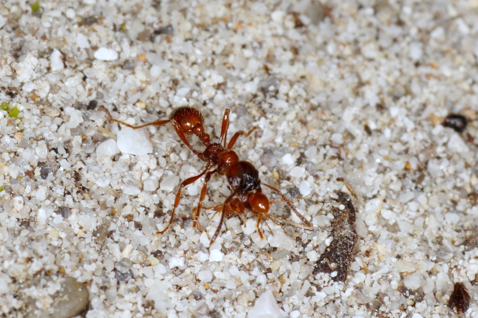Das sieht schlimmer aus, als es ist: Eine Manica rubida trägt die kleine Myrmica constricta aus dem Nesteingang; diese hält vollkommen still, wird abgesetzt und läuft dann einfach weiter