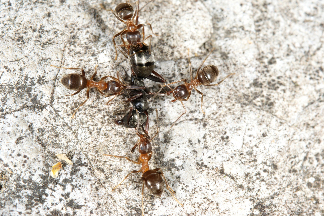 Arbeiterinnen v. Lasius emarginatus haben eine Formica fusca gefangen, diese wird gestreckt und getötet.