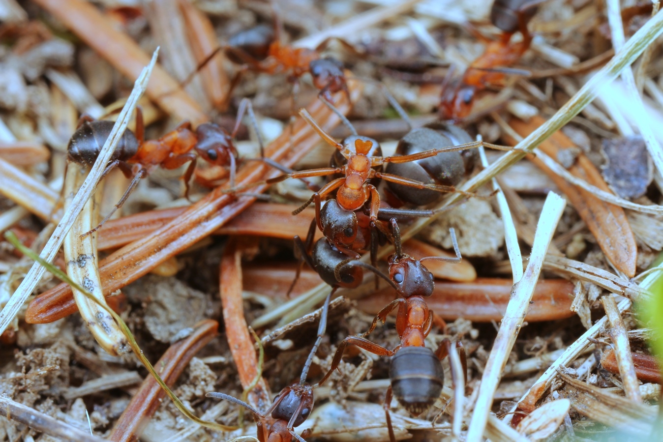 Amazonen gegen Amazonen, ein brutales Massaker, mehrere Ameisen haben sich ineinander verbissen. Konkurrenz wird brutal beseitigt
