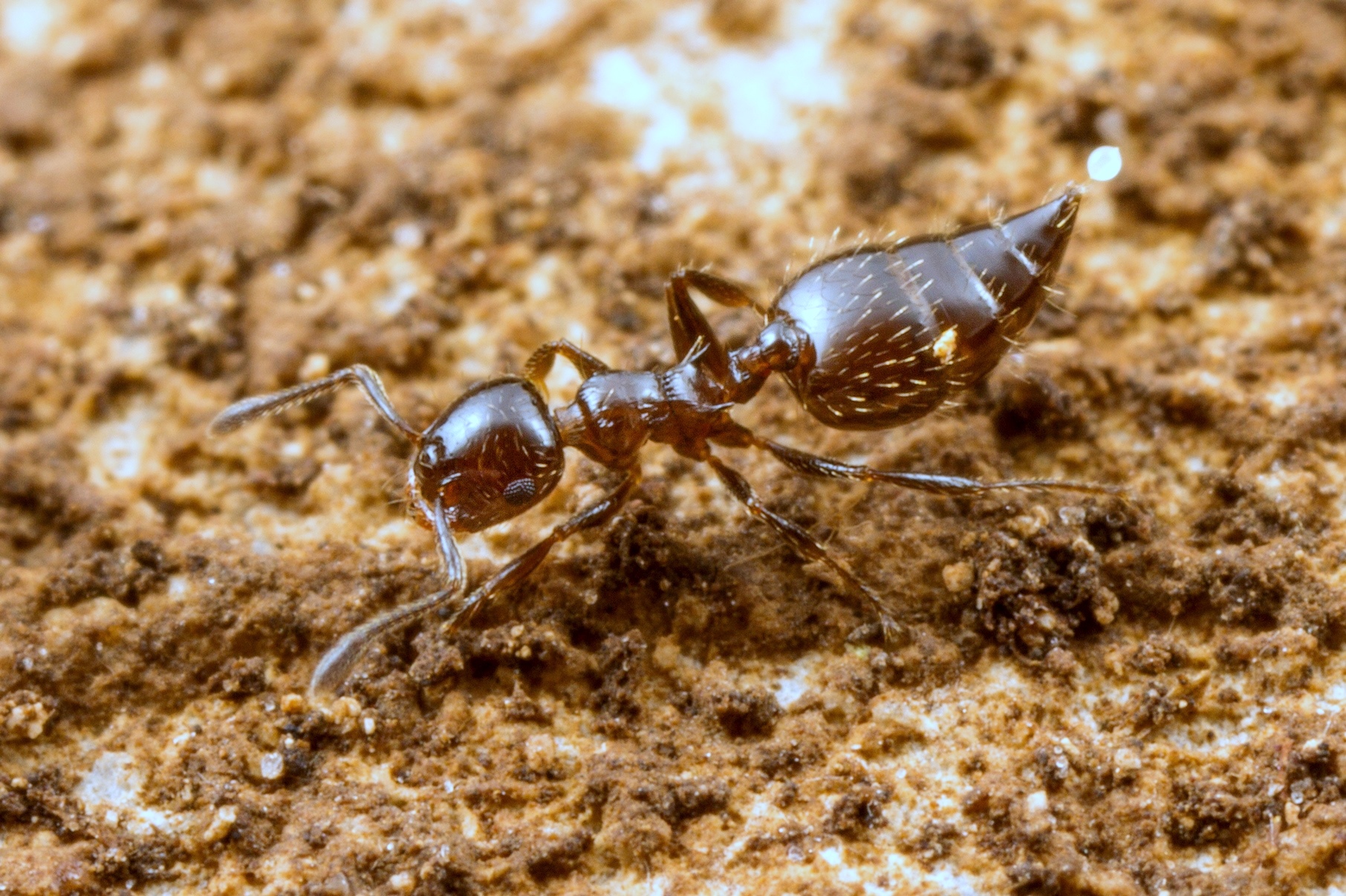 Crematogaster sordidula lässt einen Tropfen Gift am ausgefahrenen Stachel als Warnung austreten, sie kann diesen nur auf den Gegner aufstreichen