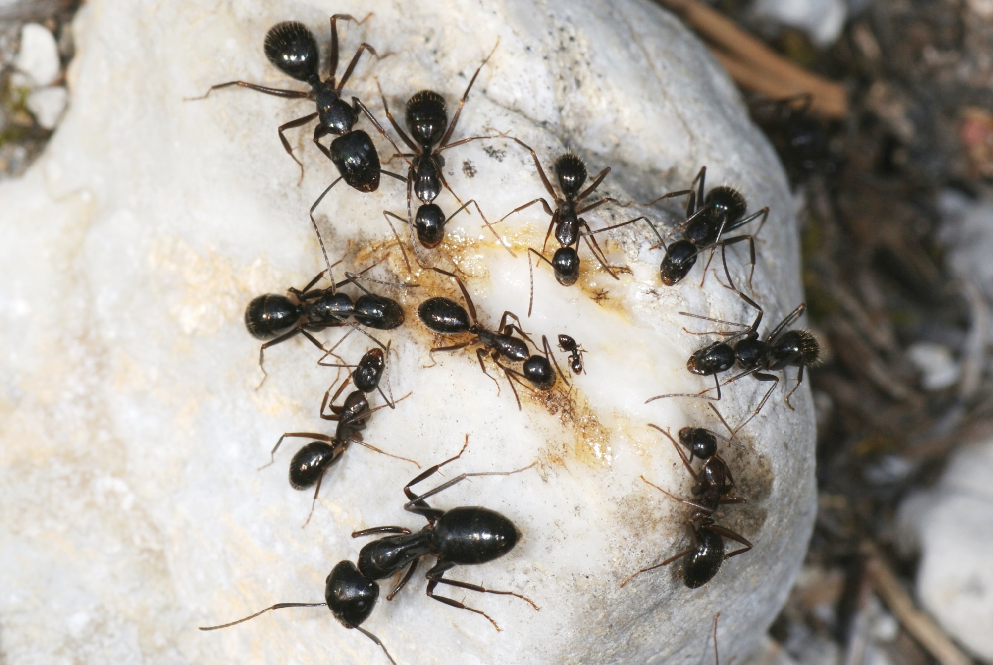 Futterplatz für Camponotus aethiops: Eine winzige Plagiolepis vindobonensis sitzt in der Mitte und wendet die Gaster drohend gegen den nächsten Konkurrenten