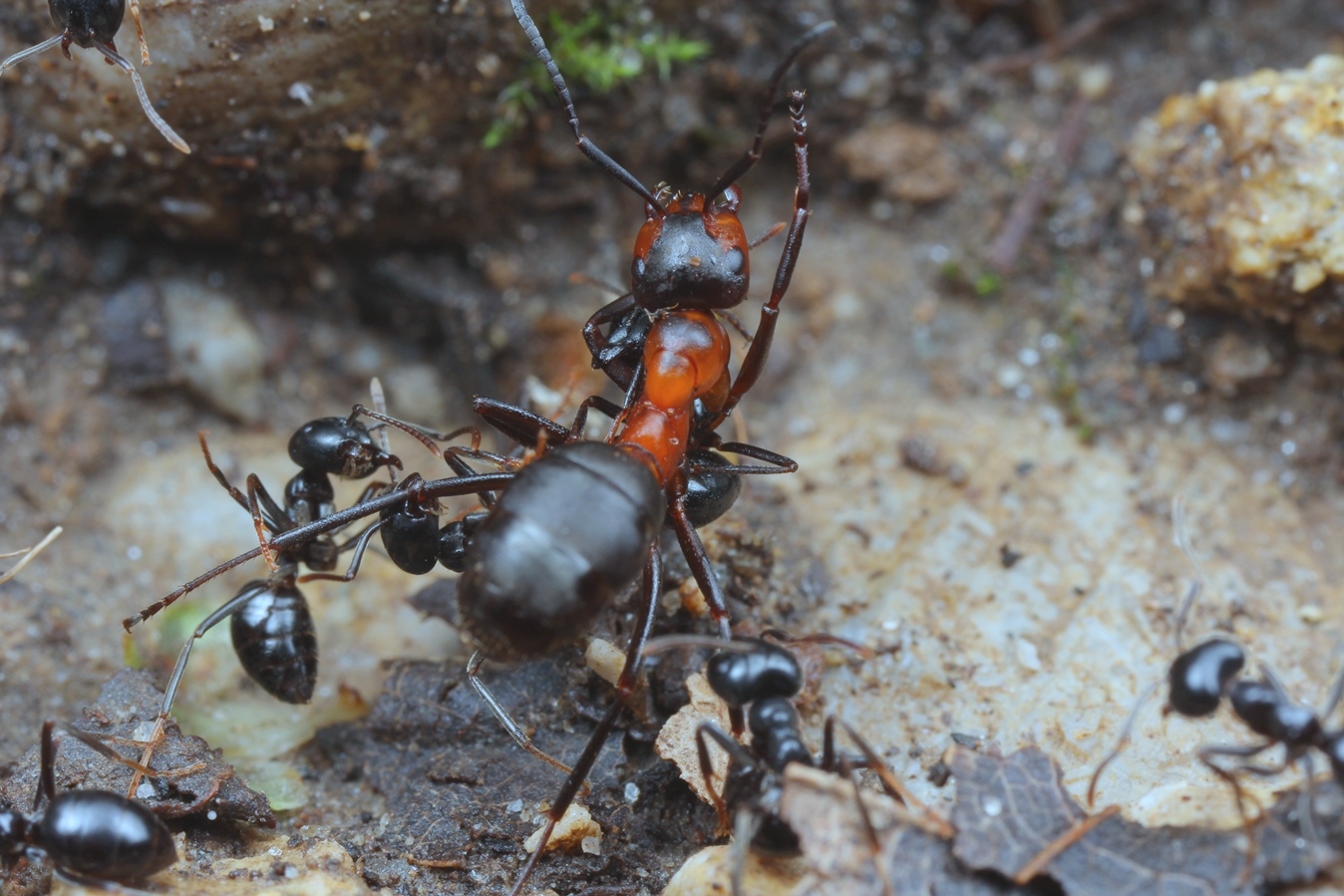 Die Amazonenameise durchbohrt die Kutikula der Feinde mit säbelartigen Mandibeln; andererseits kann sie nicht mehr selbsttätig Nahrung suchen oder aufnehmen
