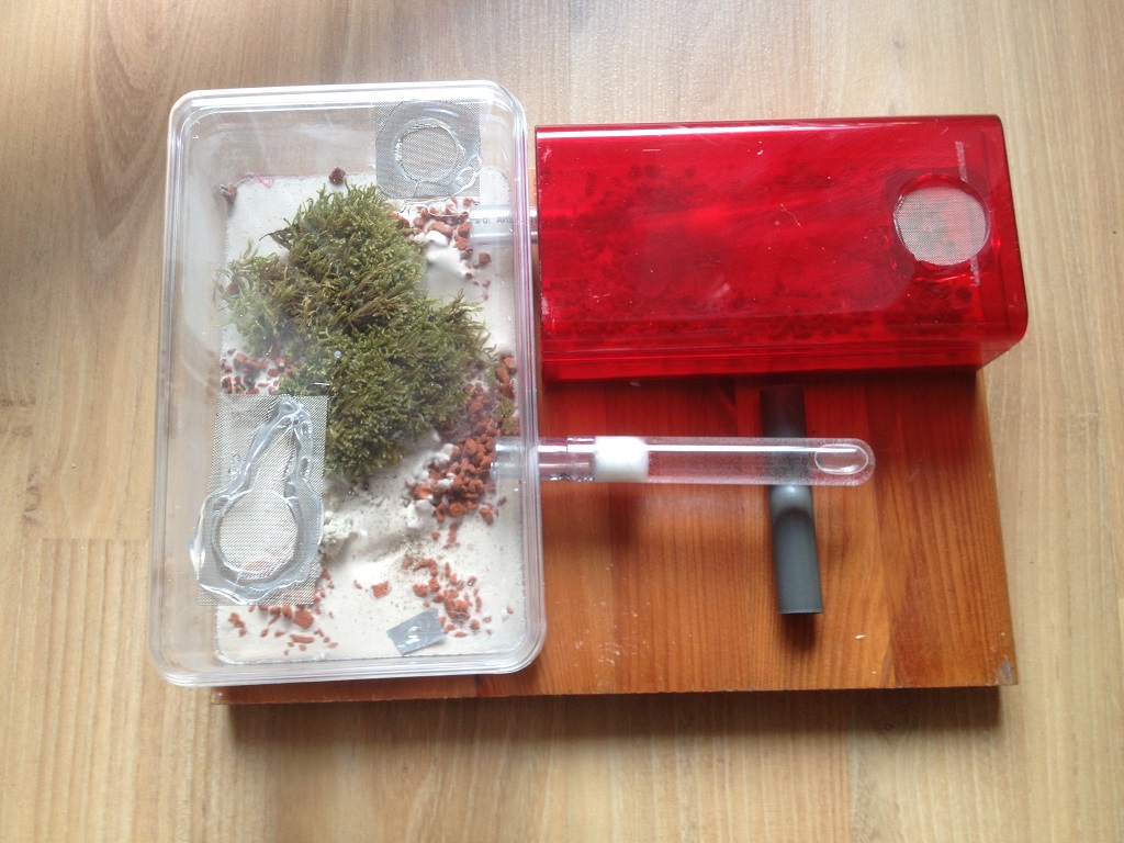 Mittlerweile ist die kleine Lasius cf flavus Kolonie etwas angewachsen und sie sind inzwischen sogar richtig hungrig nach Proteinen geworden, so dass ich ihnen eine etwas größere Behausung gegönnt habe.