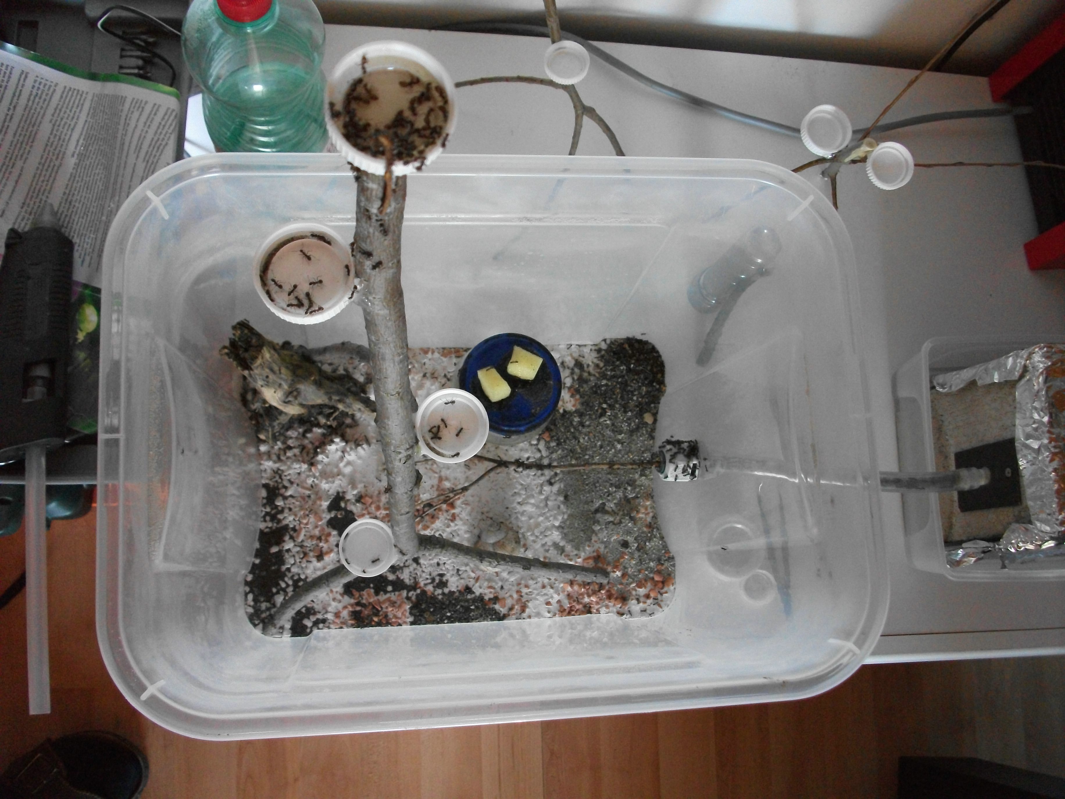 Der Boden besteht hier einfach aus Gips, wobei ich mehr oder weniger Tongranulat begefügt habe, um die Aufnahmekapazität an Wasser zu erhöhen. Im Nestbereich selbst befinden sich einfach nur noch zwei Reagenzgläser hineingelegt. Das eine, fast leere war das "alte Nest" und das neue ist einfach noch als zusätzliches Nest vorgesehen, natürlich mit voellem Tank.