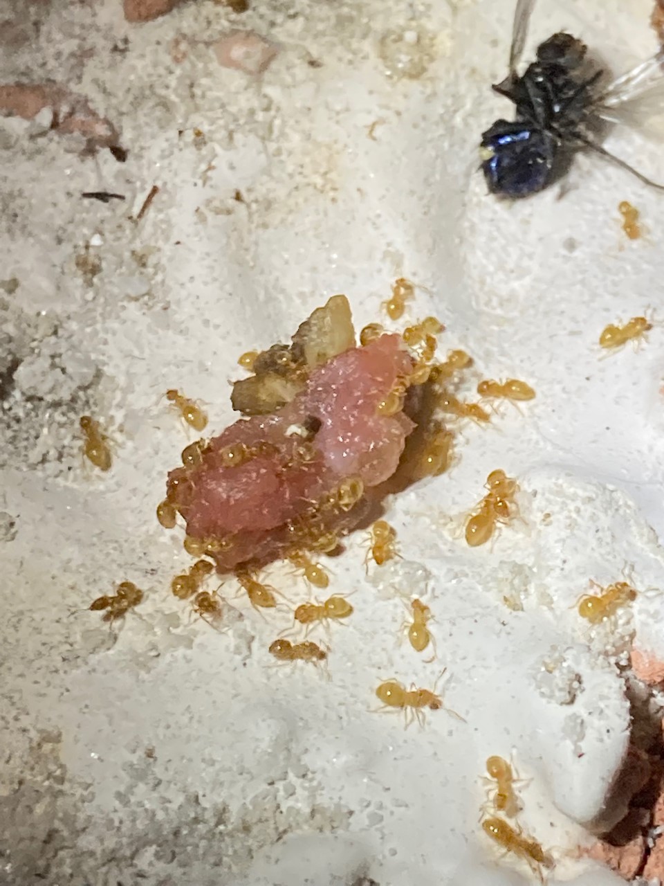 Gerade die "kleinen" freut's, denn die Temnothorax stehen wohl gerade im Vergleich zu den anderen Arten, die auch mal Fleisch annehmen, mehr auf das Fluggetier.