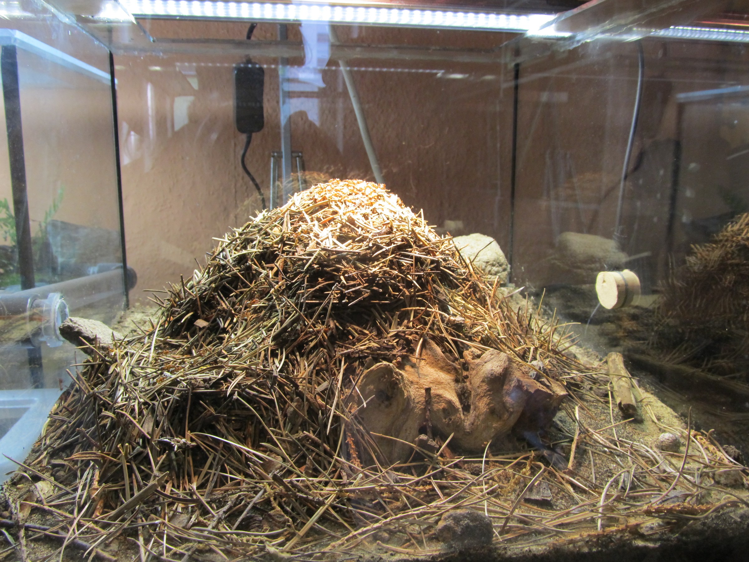 Formikarien für Waldameisen müssen daher oben offen sein (ein aufgeklebter, unterseits mit Paraffinöl bestrichener Rand verhindert die Flucht recht zuverlässig). Sehr zu empfehlen ist es, mittig über dem Formikar eine Lampe aufzuhängen,die Licht und Wärme spendet:Dann wird der Hügel genau unter dieser errichtet. Andernfalls kann es geschehen, dass der Hügel an einer Seite oder in einer Ecke aufgeschichtet wird. Sobald seine Spitze den Rand des Beckens erreicht hat, geht die Post ab ..... :D