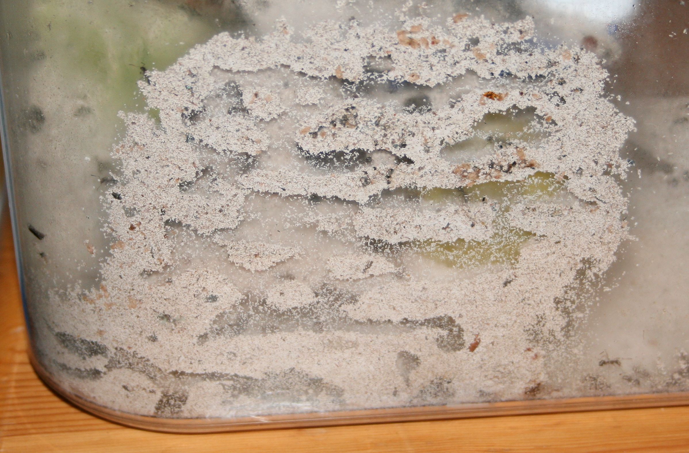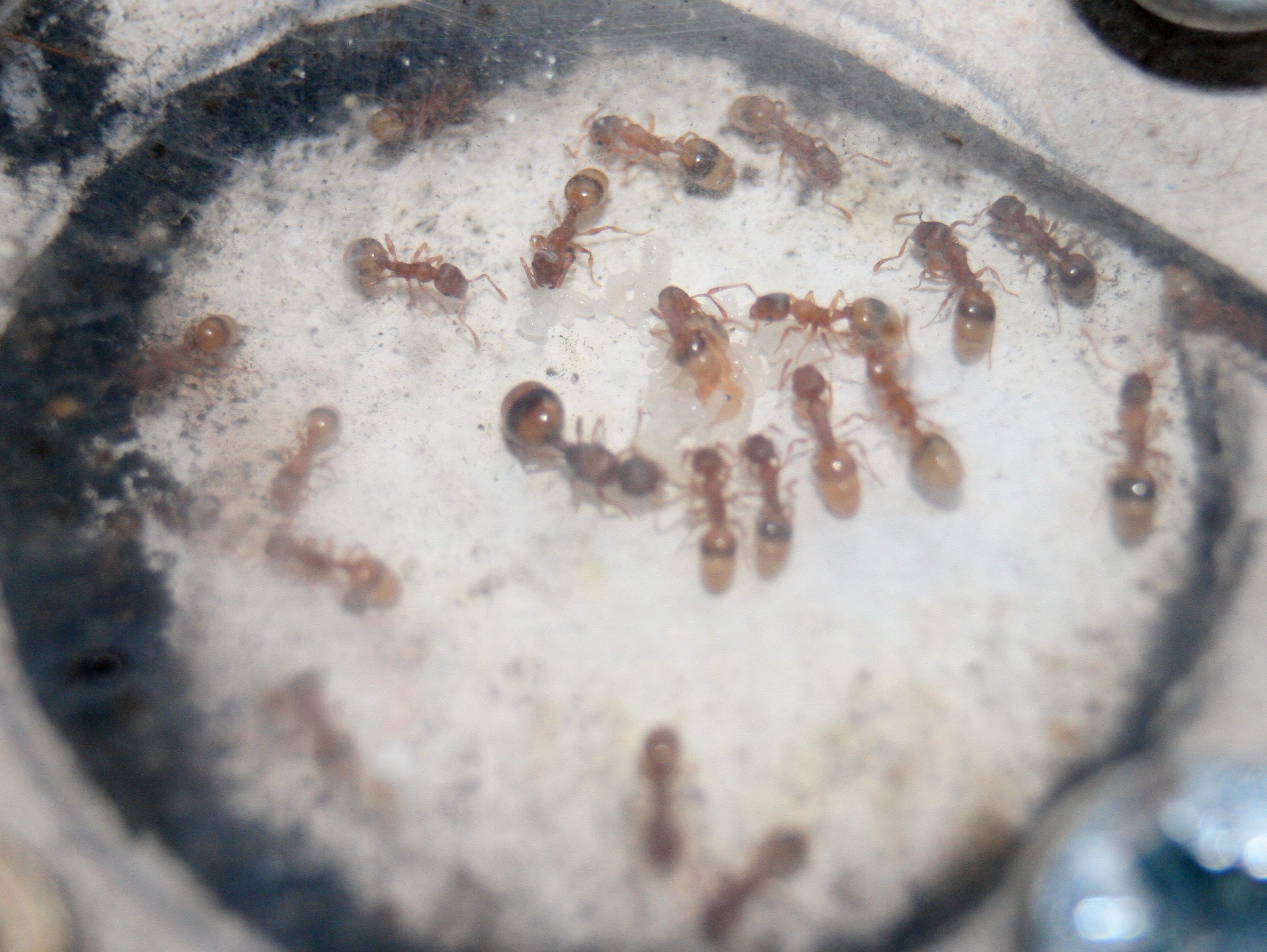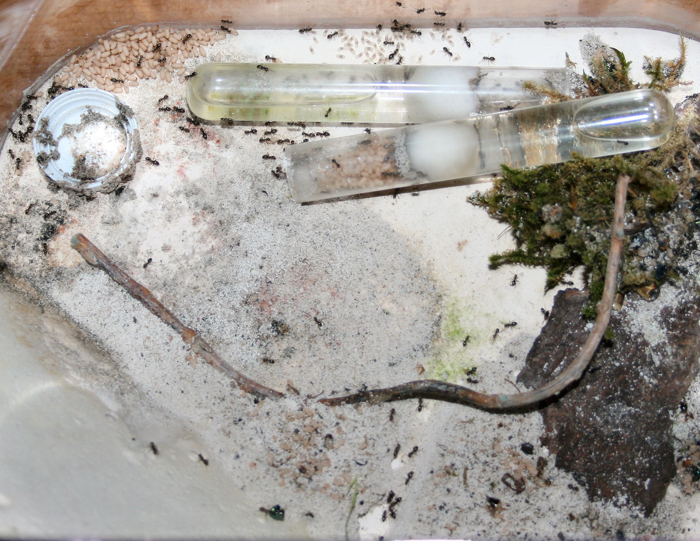 Bei den Formica liegen noch einige Puppen rum, ein großer Teil ist bereits geschlüpft und schon unterwegs, den entsorgten leeren Hüllen nach. Larven sind auch schon wieder jede Menge unterwegs.